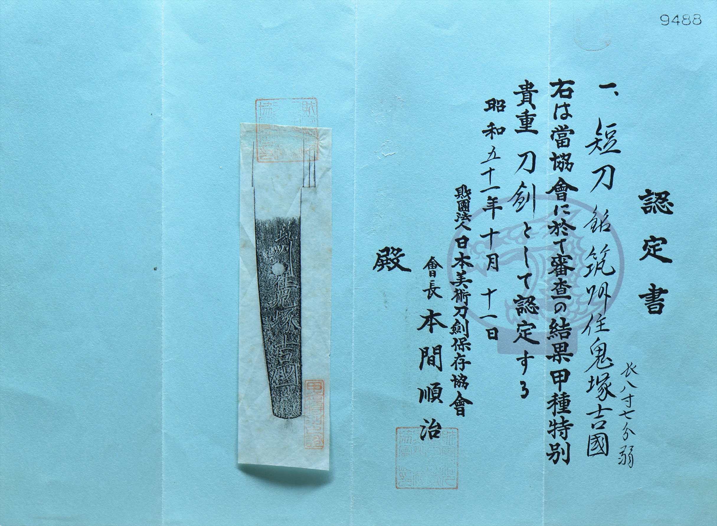 The blade is accompanied by older NBTHK Tokubetsu Kichō papers (Kōshu / Class A), issued in 1976, confirming the authenticity of the signature and recognizing the sword as an especially precious example under the former NBTHK appraisal system, which predates the modern Hozon structure.