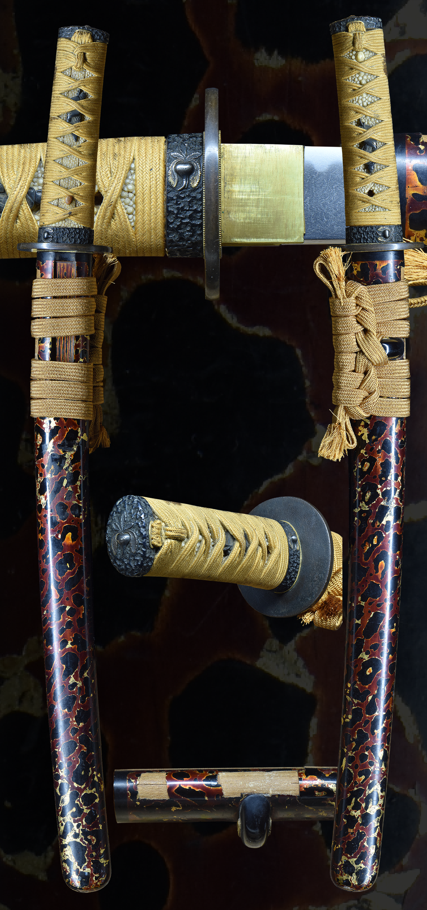 Gold tsuka ito shakudo fuchi-kashira with a daikon in sliver and gold. Blue-black shakudo menuki. The thick heavy tsuba very black shakudo with a slightly textured surface. The saya is multicolored, multilayered red and black lacquer with gold foil, some damage. . Horn kurikata. The habaki and seppa are gold foil. gold foil.