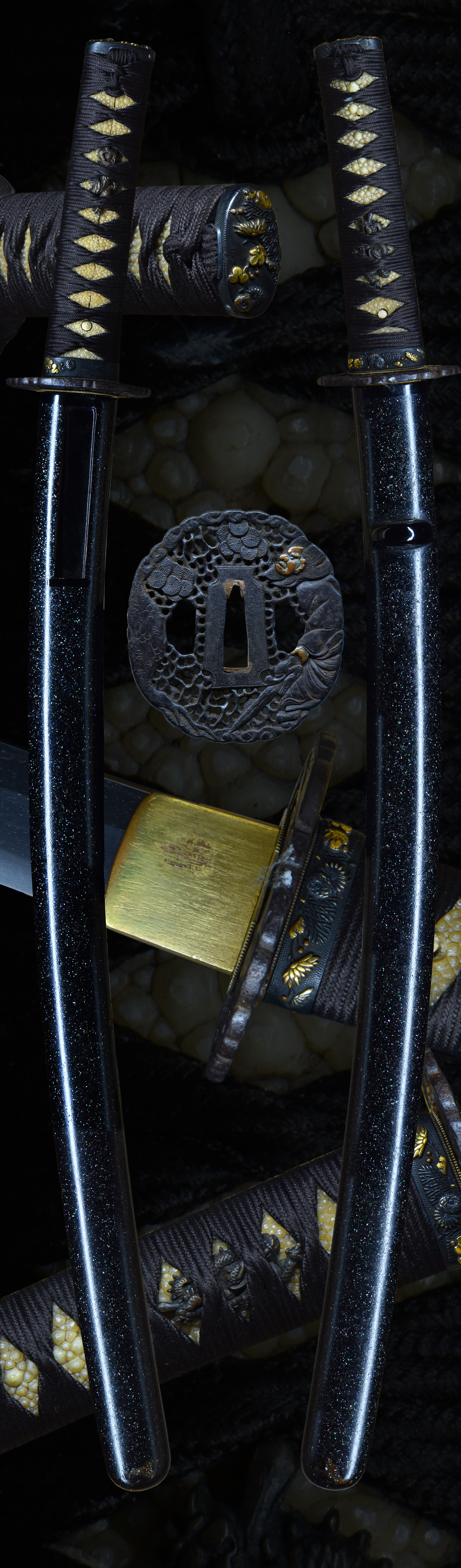 The sword is mounted in a well-matched handachi-style koshirae. The saya is finished in black lacquer with subtle gold flecking, giving it an elegant and refined appearance. The tsuka is wrapped in dark silk over samegawa and fitted with coordinated metal mounts accented with gilt highlights.