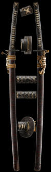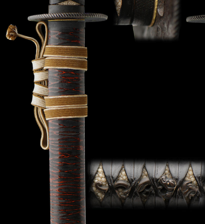Very good quality koshirai in excellent shape. The handle is wrapped in lacquered leather. The saya is in extremely good shape and has no visible chipping. To have a saya made like this today would cost well over $2000 in Japan. The fact that's these mounts are old and the handle is in great shape also makes this koshirai unique. Mounts are held together with a small half tsunagi, not full size for display purposes.