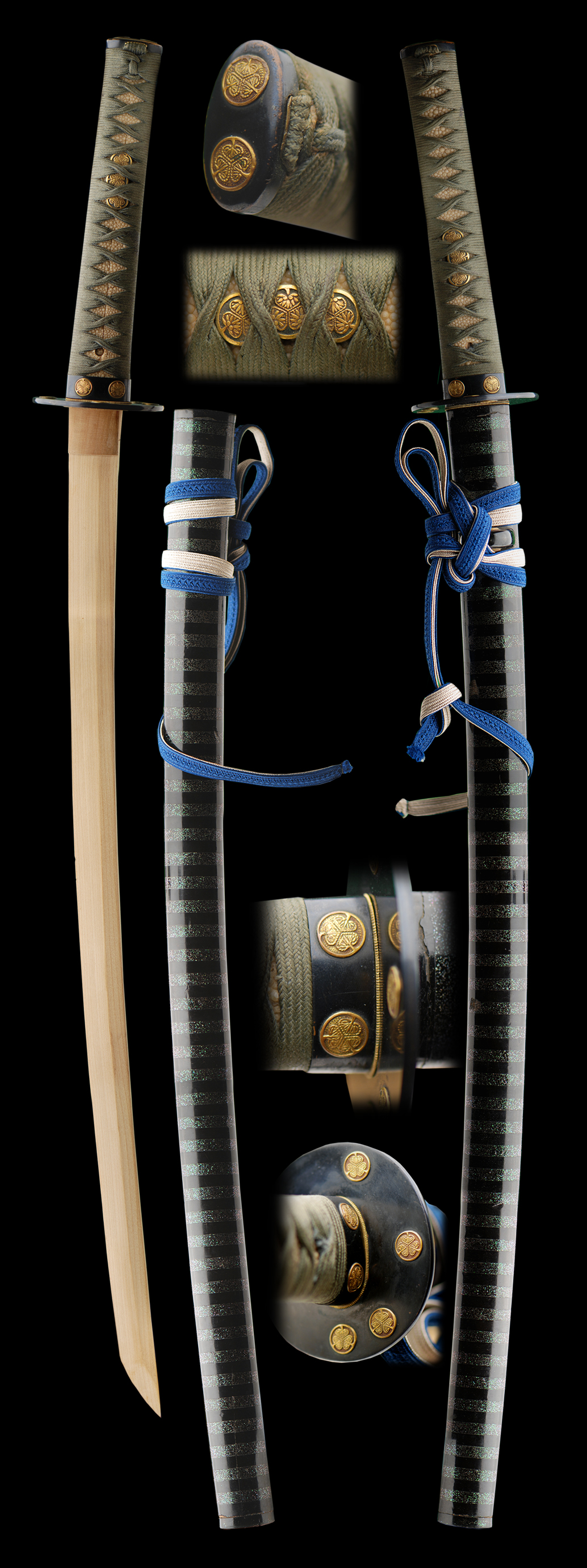 Very good quality koshirai in excellent shape. The handle is the original wrapped silk and not newly done. The saya is in extremely good shape overall. The fact that's these mounts are old and the handle is in great shape also makes this koshirai unique. Mounts are held together with a tsunagi. These are very nice mounts.