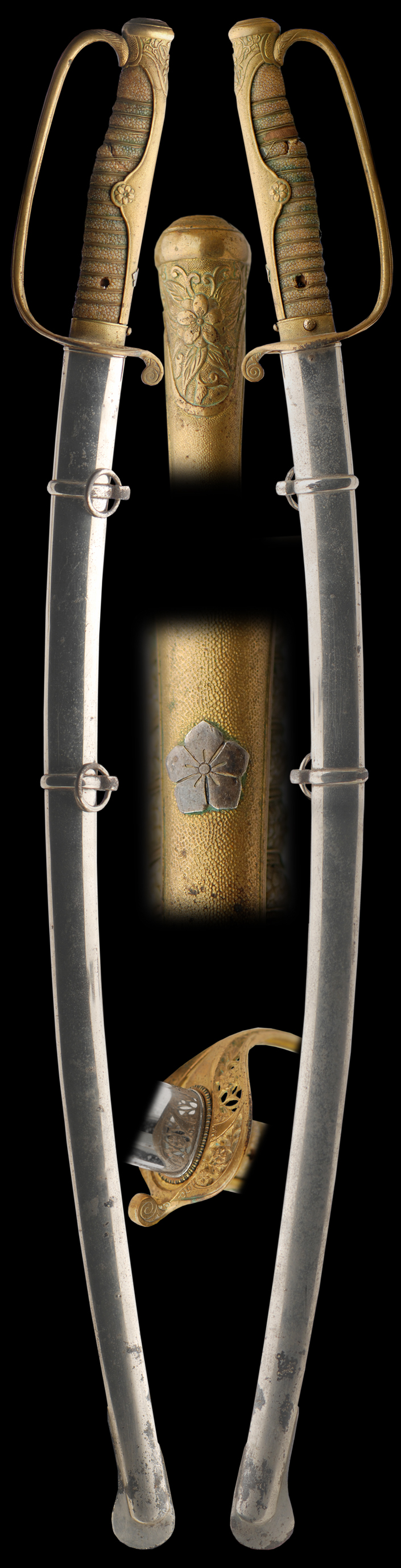Very good quality koshirai in excellent shape. The handle is the original wrapped silk and not newly done. The saya is in extremely good shape overall. The fact that's these mounts are old and the handle is in great shape also makes this koshirai unique. Mounts are held together with a tsunagi. These are very nice mounts.