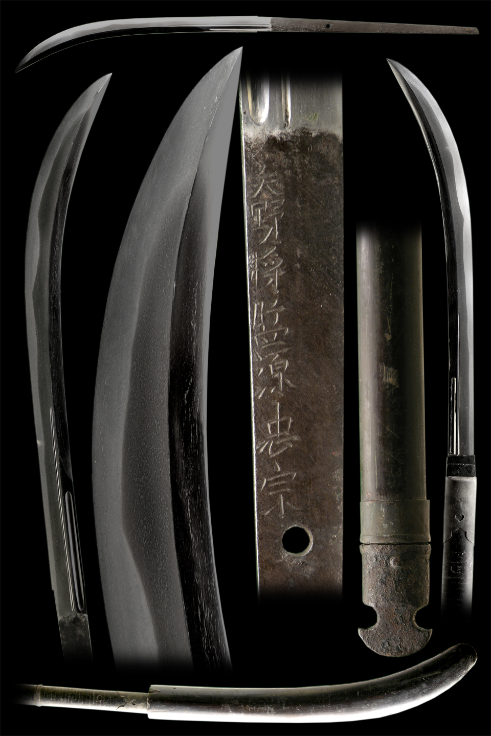 This Naginata comes with the original pole and saya. The saya has some damage and has been repaired but is overall in sold condition. The pole is in overall good condition with very little damage. This naginata may have had some kind of a tsuba or thick seppa as there is about 1/4" space between the bottom of the habaki and the top of the pole. It is hardly noticeable and doesn't take away from the overall appeal of this item. The blade is in a beautiful old polish with very minor scuffing. Some coarse hada is visible as shown in the picture above. The hada is very clear and visible as is the hamon. the hamon has many hataraki and is nicely done. This is a very good example of a Shinto Naginata that is Ubu, signed and fully mounted.