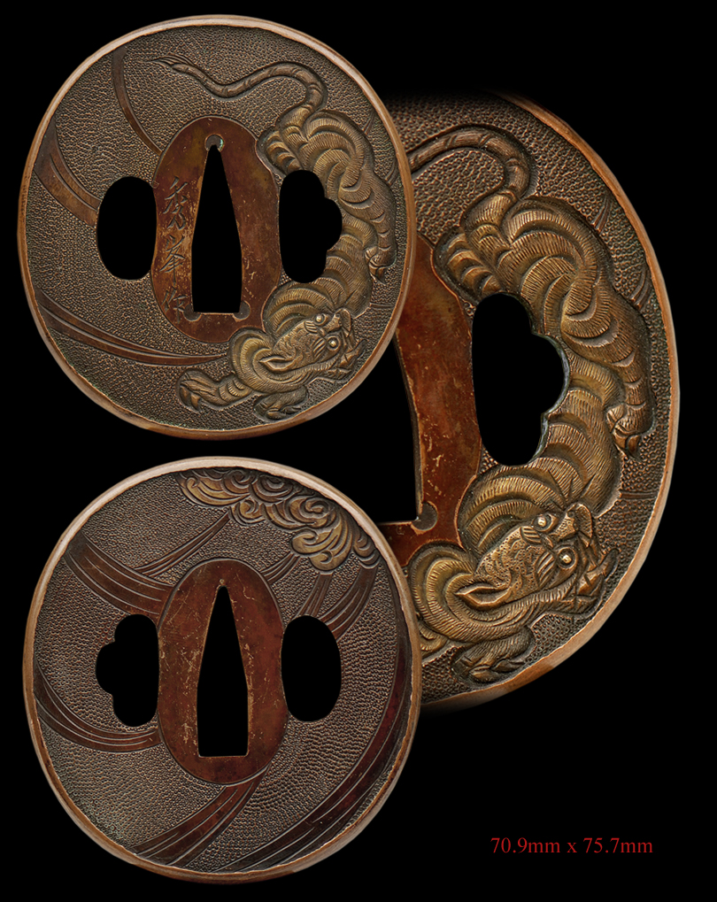 This is a very beautifully carved tsuba that is signed. The details are powerful and the tiger is deeply carved.