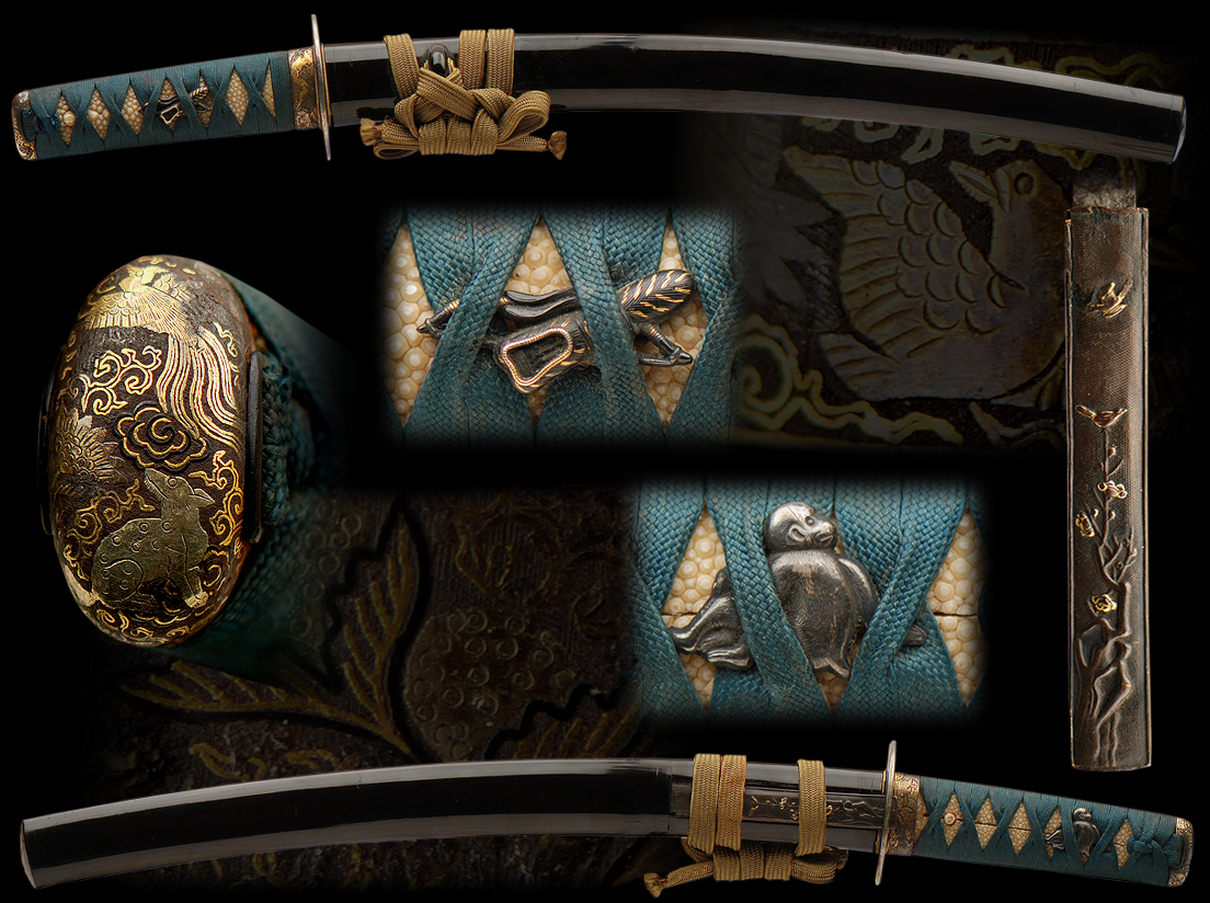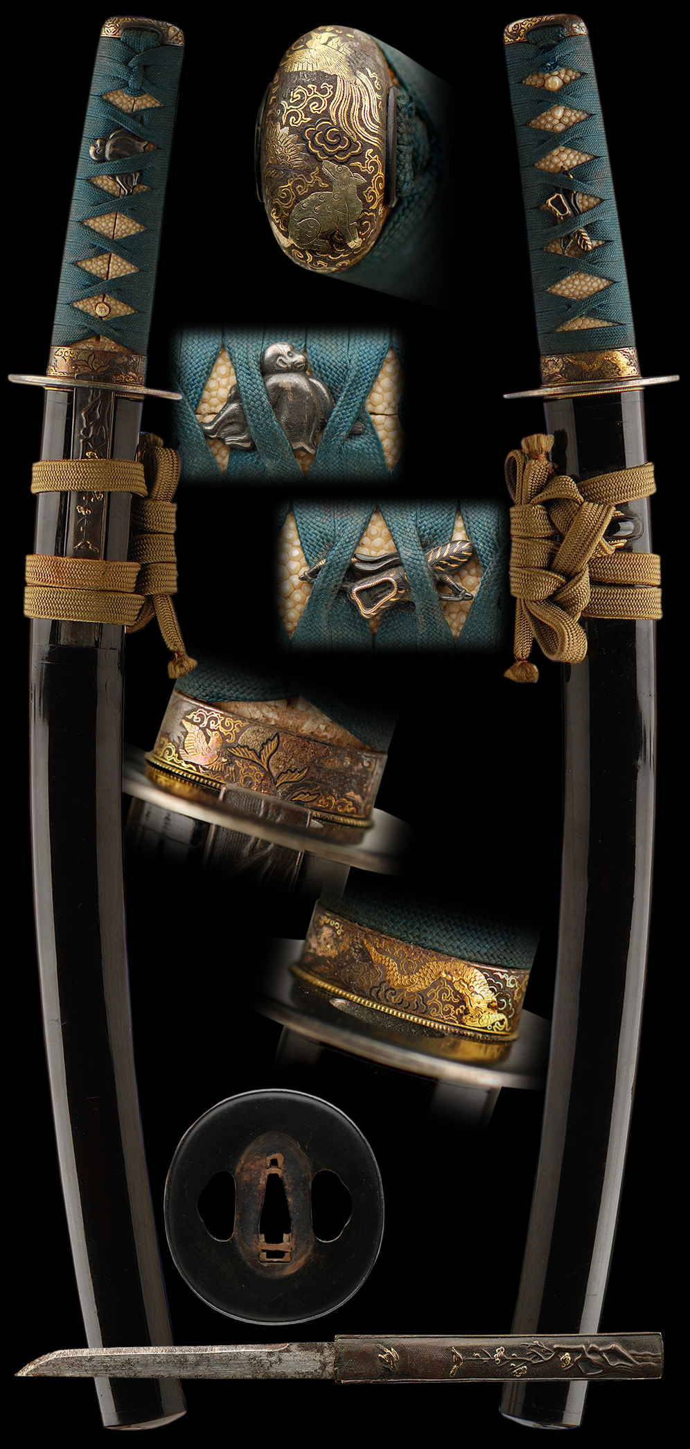 A beautiful koshirai for a wakazashi this set is adorned with multitude of motifs representing the mystical animals that are found in Japanese mythology. There are dragons which:In both Chinese and Japanese mythology, the dragon is closely associated with the watery realm, and in artwork is often surrounded by water or clouds. In myth, there are four dragon kings who rule over the four seas (which in the old Chinese conception limited the habitable earth).