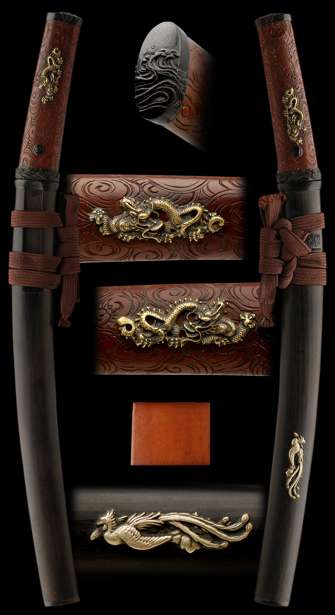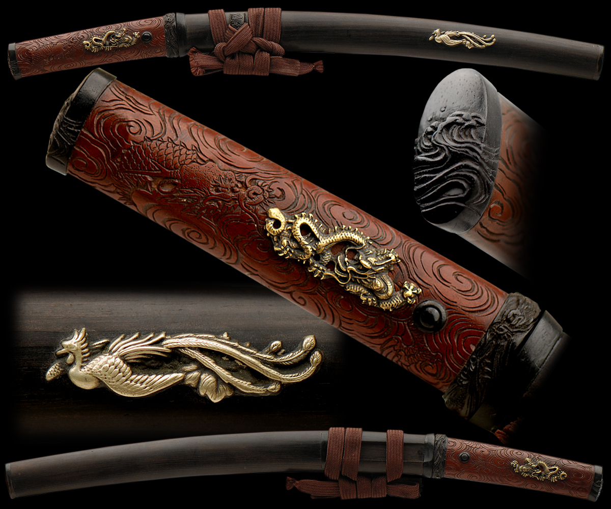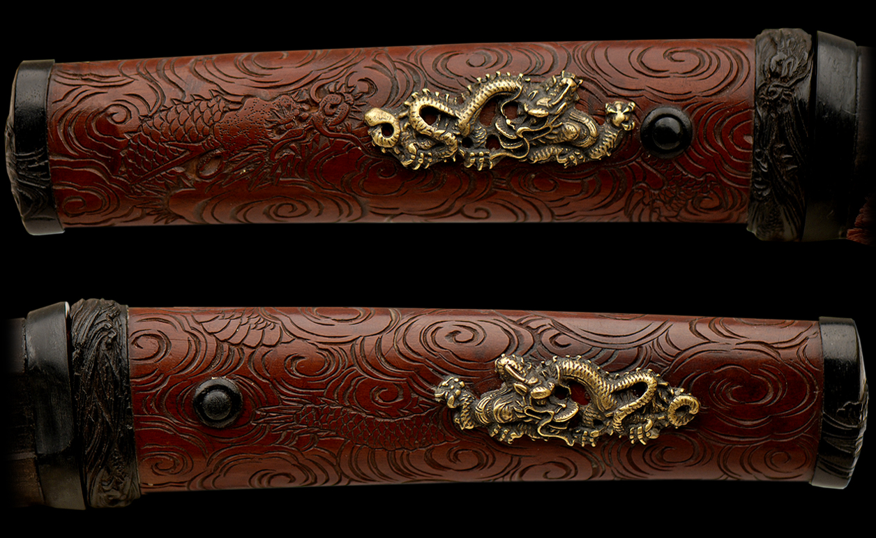 An exquisitely carved tsuka in red lacquer of dragons adorns this unique koshirai. The saya is a wood texture in very fine condition. The theme which is quite popular is of Dragons and Phoenix:In both Chinese and Japanese mythology, the dragon is closely associated with the watery realm, and in artwork is often surrounded by water or clouds. In myth, there are four dragon kings who rule over the four seas (which in the old Chinese conception limited the habitable earth).