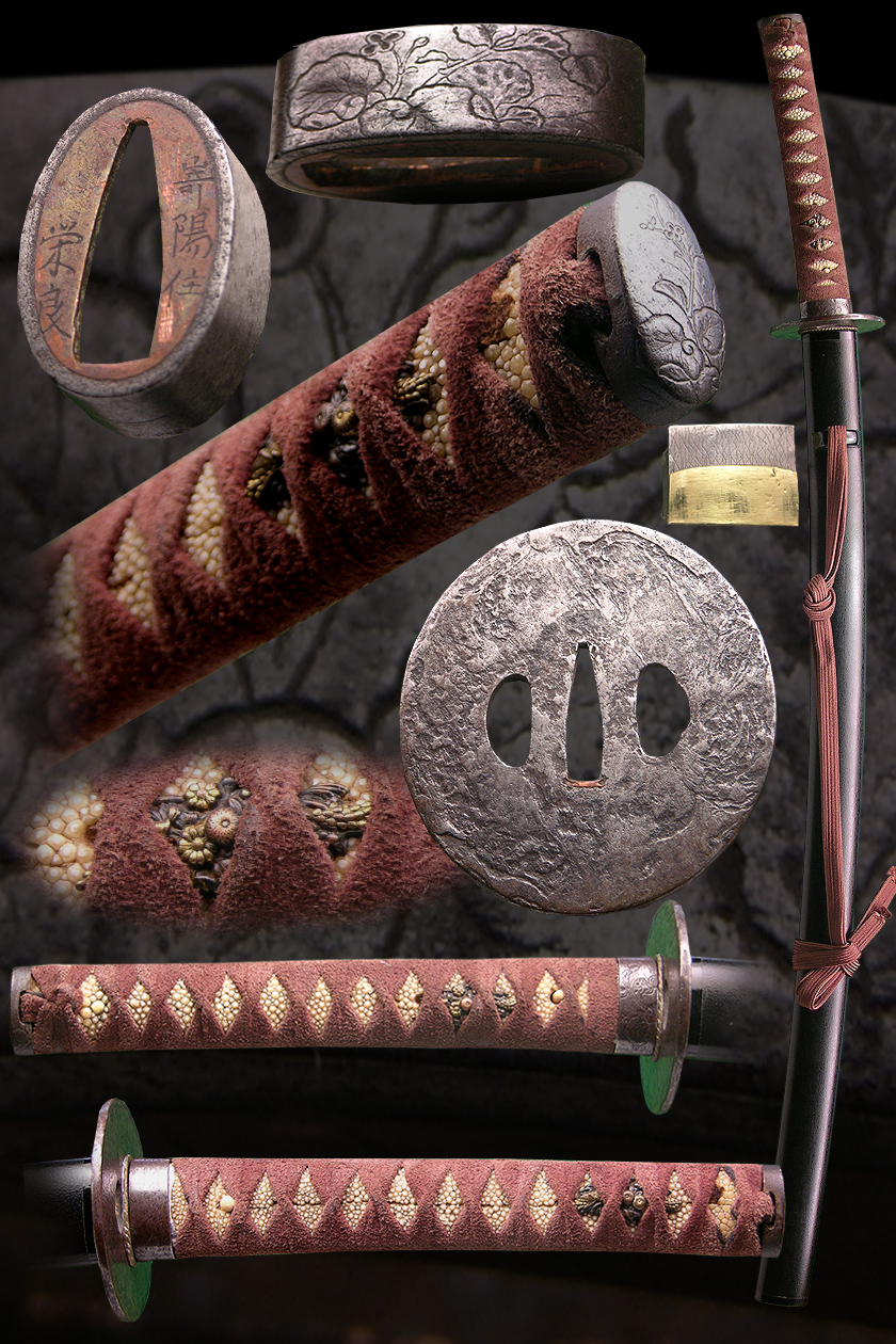 These fittings are old and date back to the shinto era most likely. They show some wear but the motif is very nicely preserved. The handle appears to be re- wrapped in leather and is in good shape. the saya is new to the sword and is clean inside to preserve the condition of this sword.