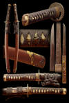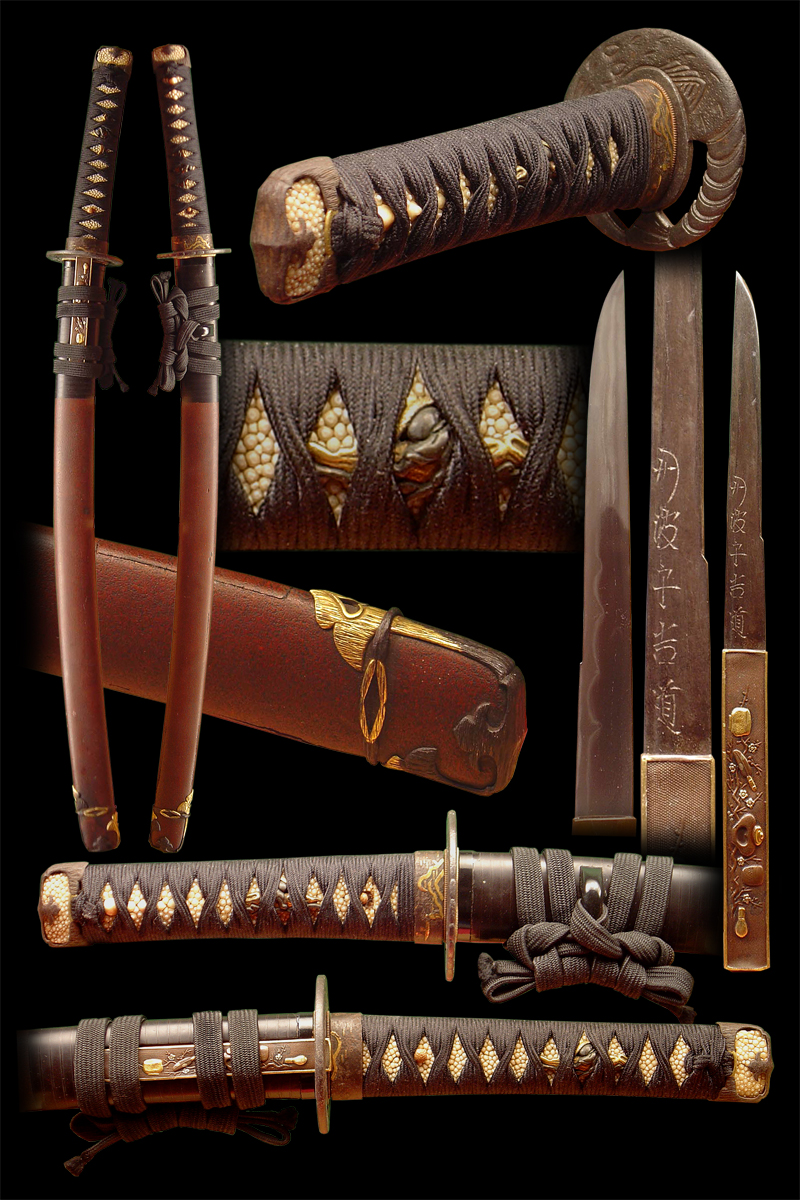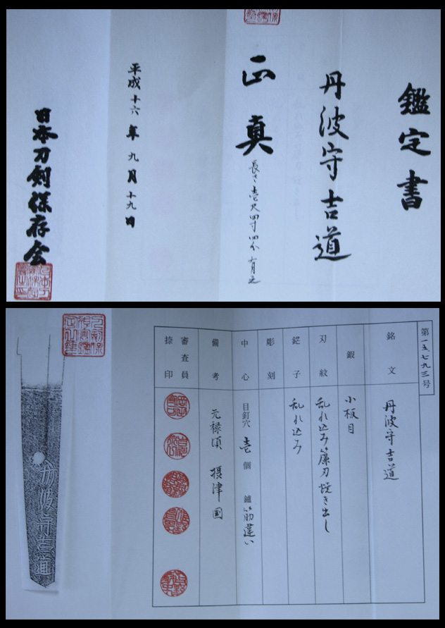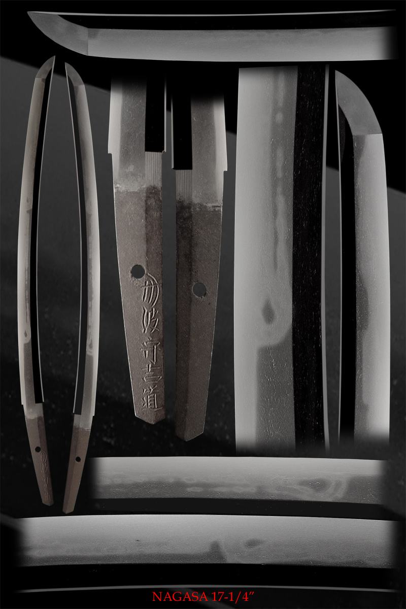 This is an excellent Yoshimichi wakazashi. The work has incredible activity in it. The sudareba is very well done and has an abundance of ashi. Many hataraki are clearly visible and the sword has no flaws. It is in a fresh new polish that really has brought out the beauty of this sword. The hada is silky and has a whitish appearance to it and is very tightly forged. It has also the typical Mishina boshi style. The overall shape, curvature and quality of this sword make this a fine wakazashi by Tamba No Kami Yoshimichi.