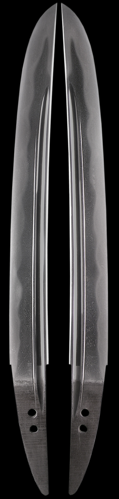 This fine tanto is very stout and is flawless. The hamon is large and beautiful, its has an abundance of activity. The hada is very well forged and has a rich look to it. Horimono are well carved and add to the elegance of this beautiful tanto.