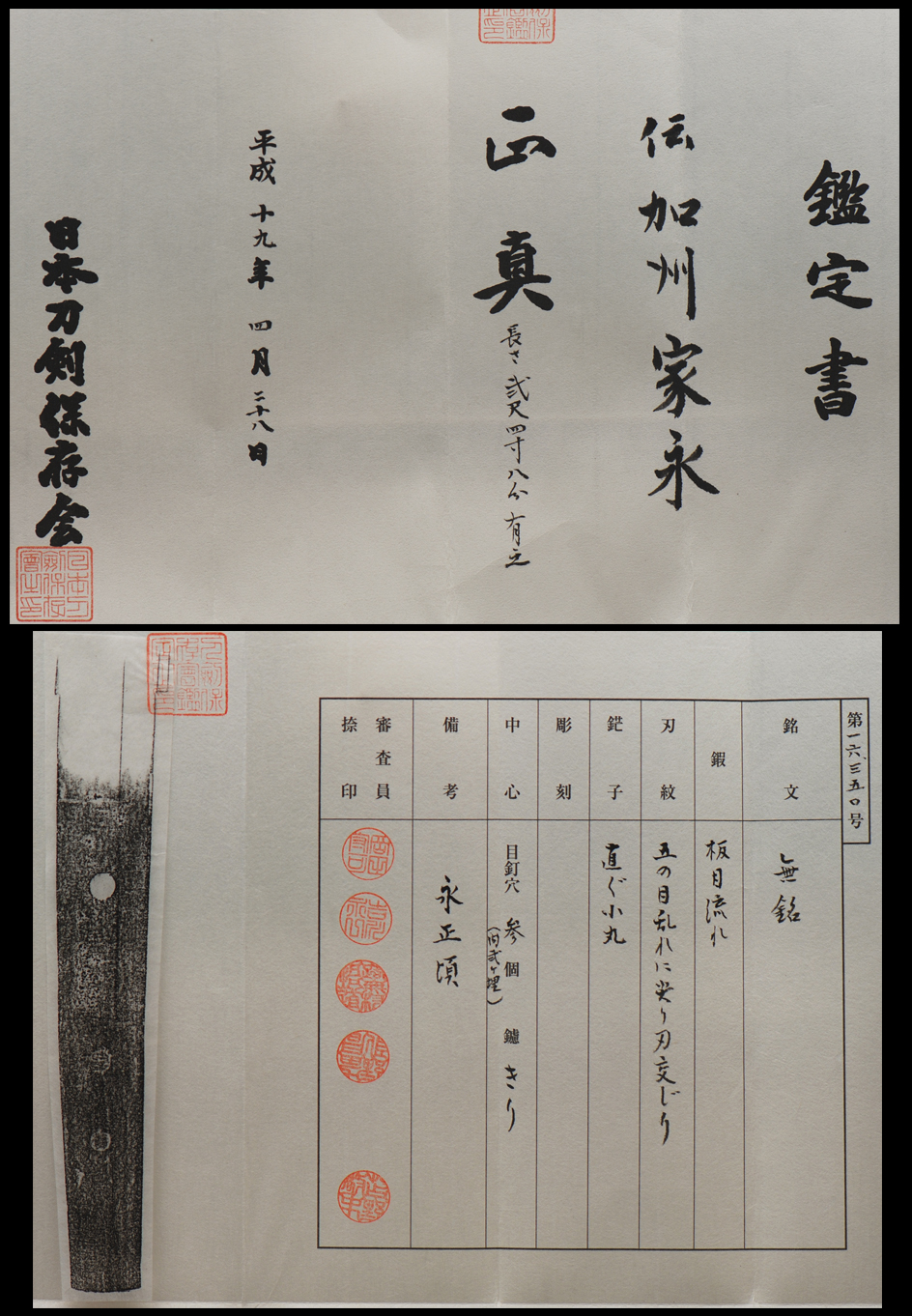 Nakago: 3 mekugiana (two of which are plugged0, yasurime is kiri