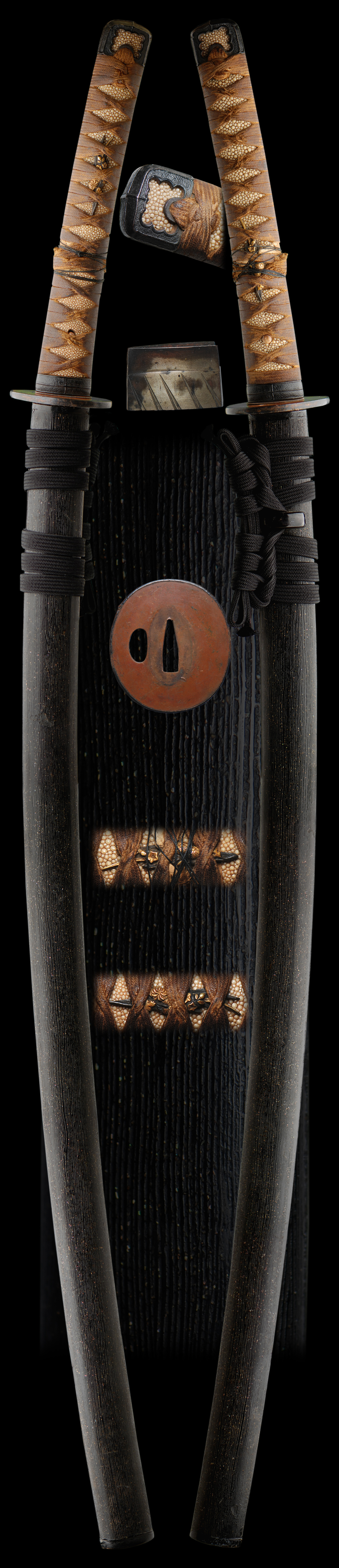 The mounts are complete and original to this katana. The saya is not split but has some lacquer chipping off in some places. The lacquer is approximately 85%-90% intact. Overall this is a nice old samurai sword.
