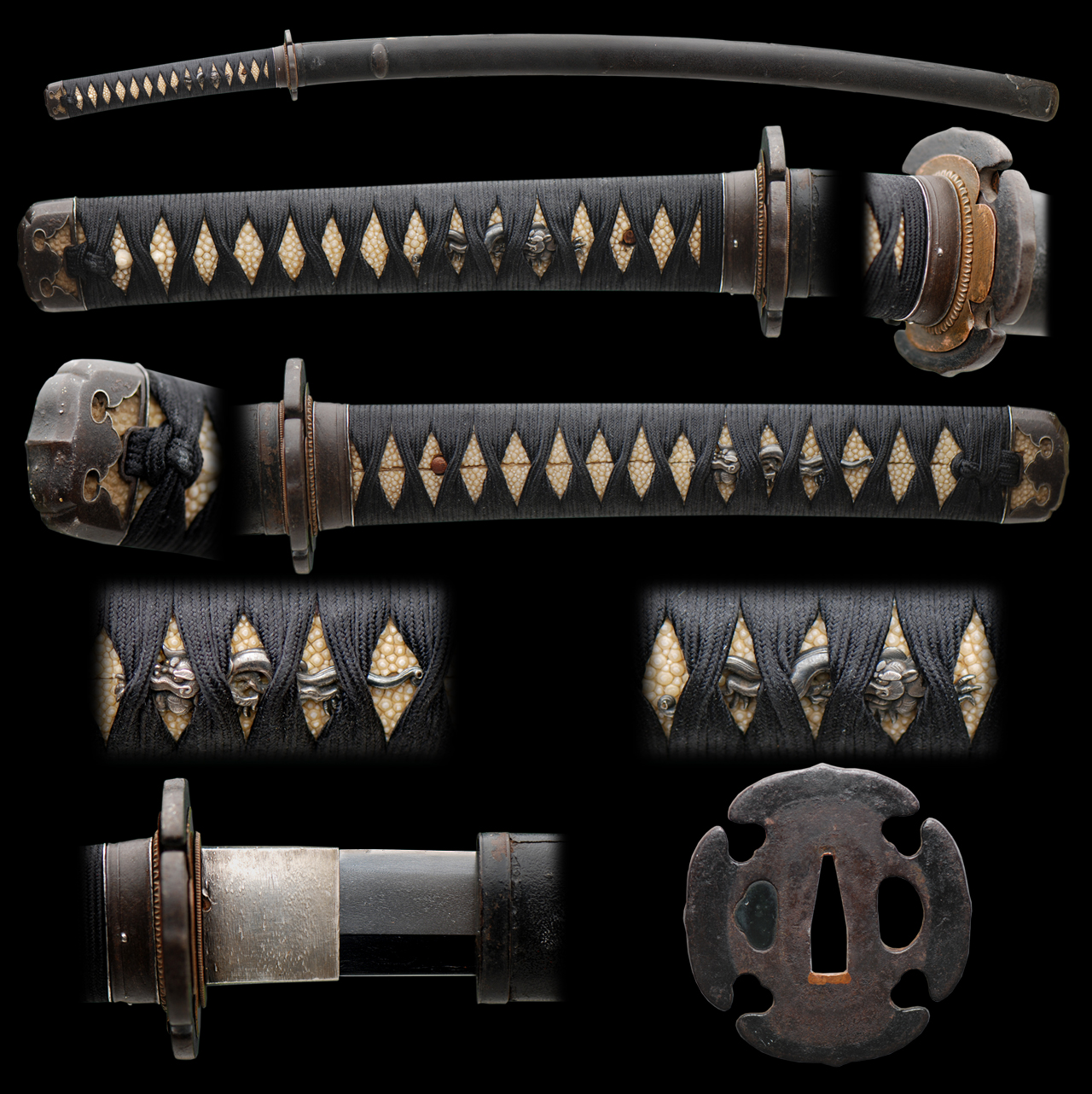 The mounts are original to this sword. the handle is sound and wrapped in silk. The say has some lacquer chipping from it but is not split. Overall this sword is a very nice old katana in original mounts.
