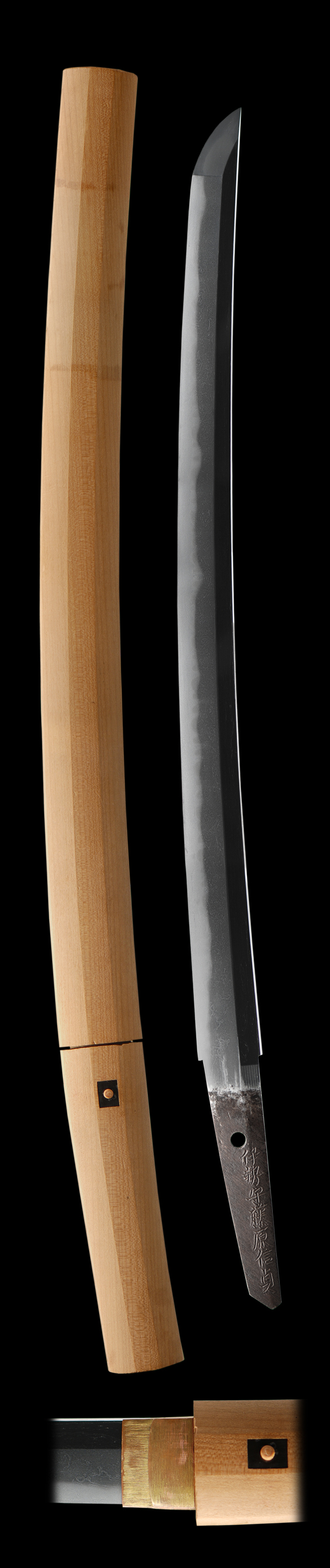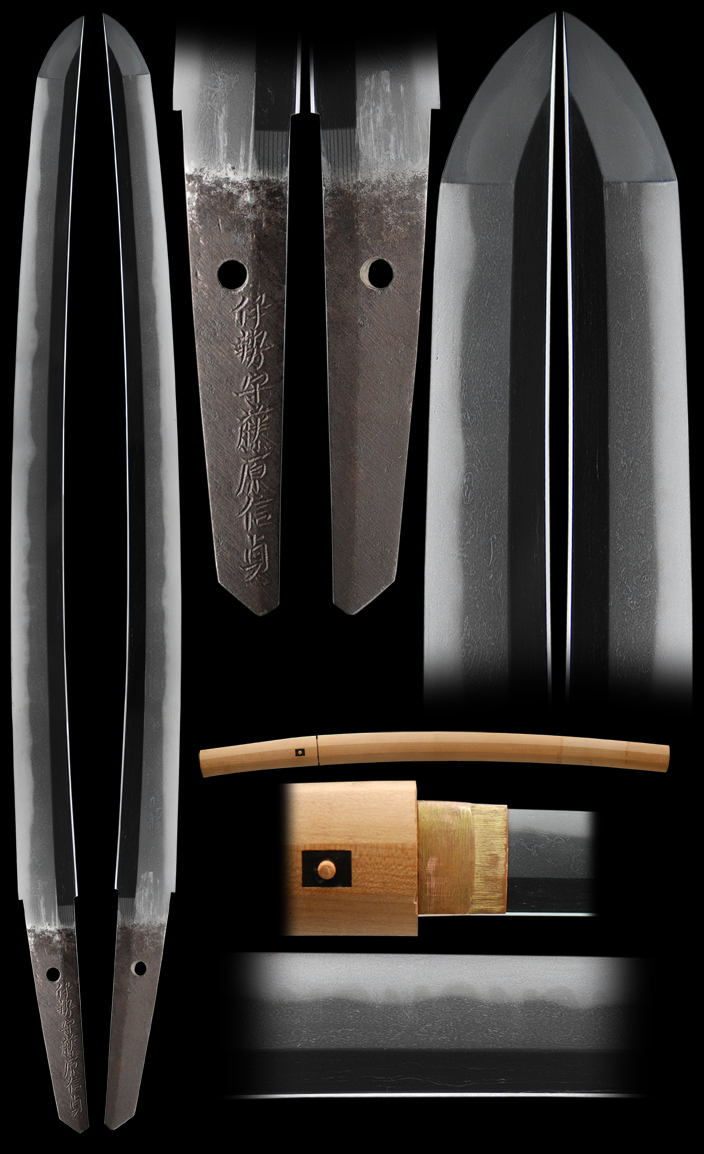 This sword is in excellent shape and has no flaws. The hada is very beautiful and silky looking and is very well forged. The hamon is a nice gunome style with great activity. The sword was once owned by the metropolitan museum of art in New York. The signature is 100% correct.