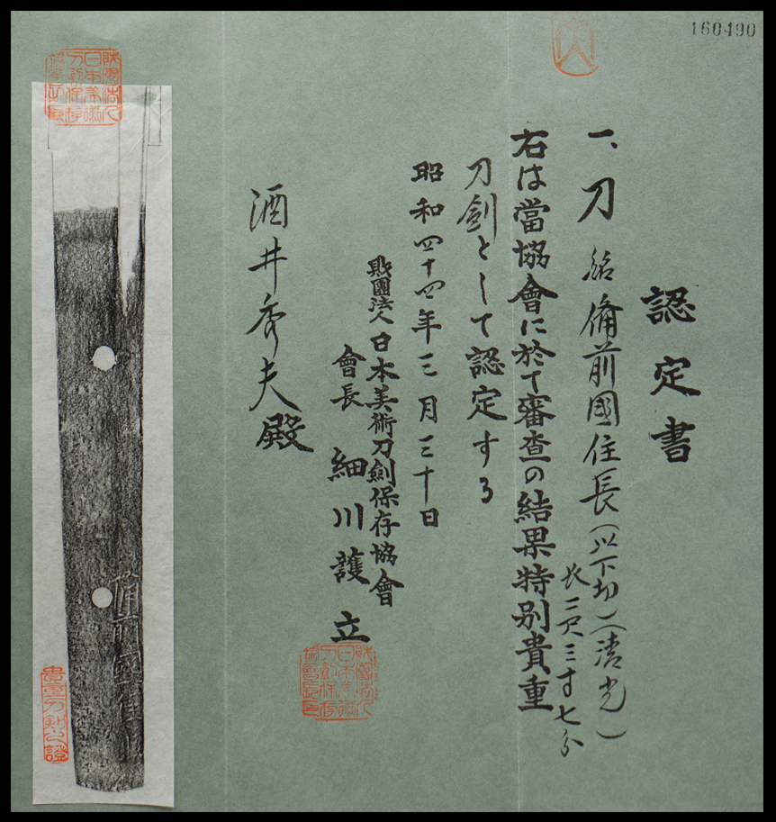 As a result of a shinsa at this organization, the above item has been recognized as a Tokubetsu Kichô Tôken, March 30, 1969 NBTHK
