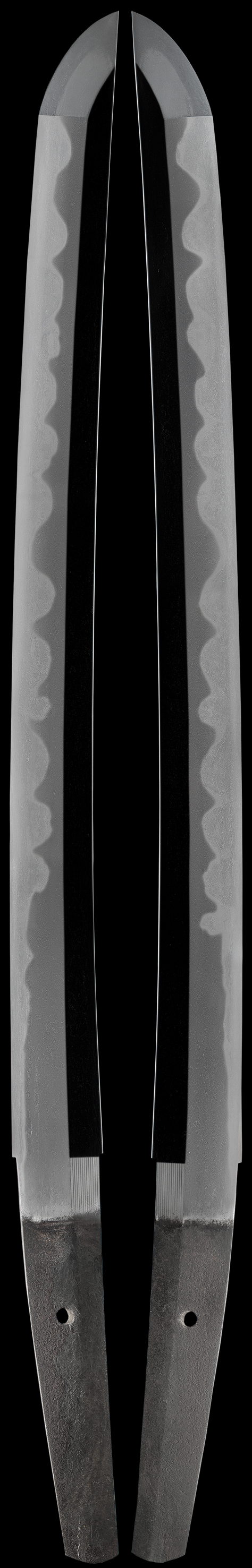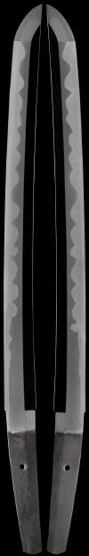 This sword is very well made. The hada is very rich looking and well forged on this sword. The hamon is full of activity (hataraki). The exceptional thing about this sword is its size! This sword is as wide as two katana! It is the strongest wakazashi that we have ever sold. Please look at the measurements of this sword carefully to understand that this was a special ordered sword.