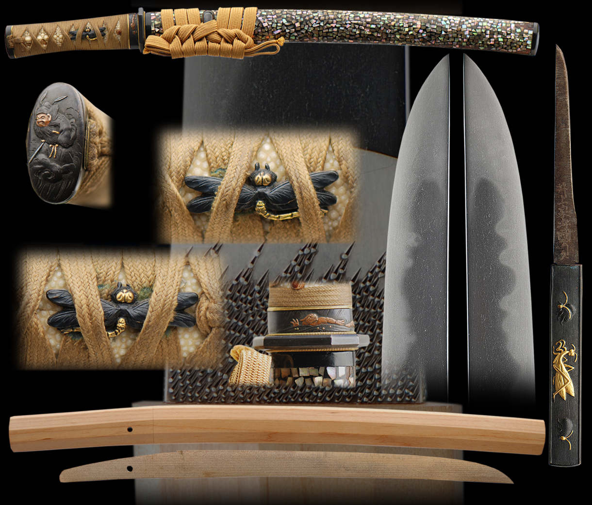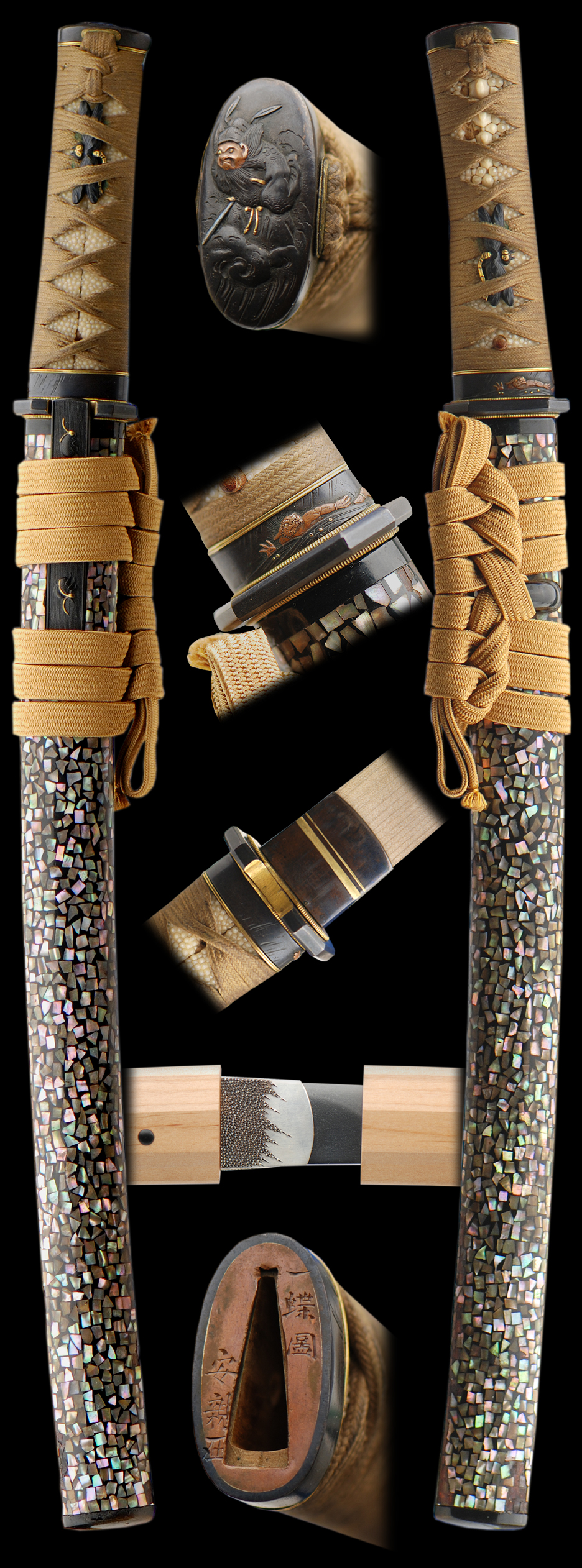 This is a very beautiful wakazashi with exquisite koshirai. The saya is lacquered with inlayed abalone shell. The work is very fine on this sword and the hamon has many hataraki that add to its beauty. This is a very fine sword that is in great polish and has no flaws. the pictures speak for themselves.