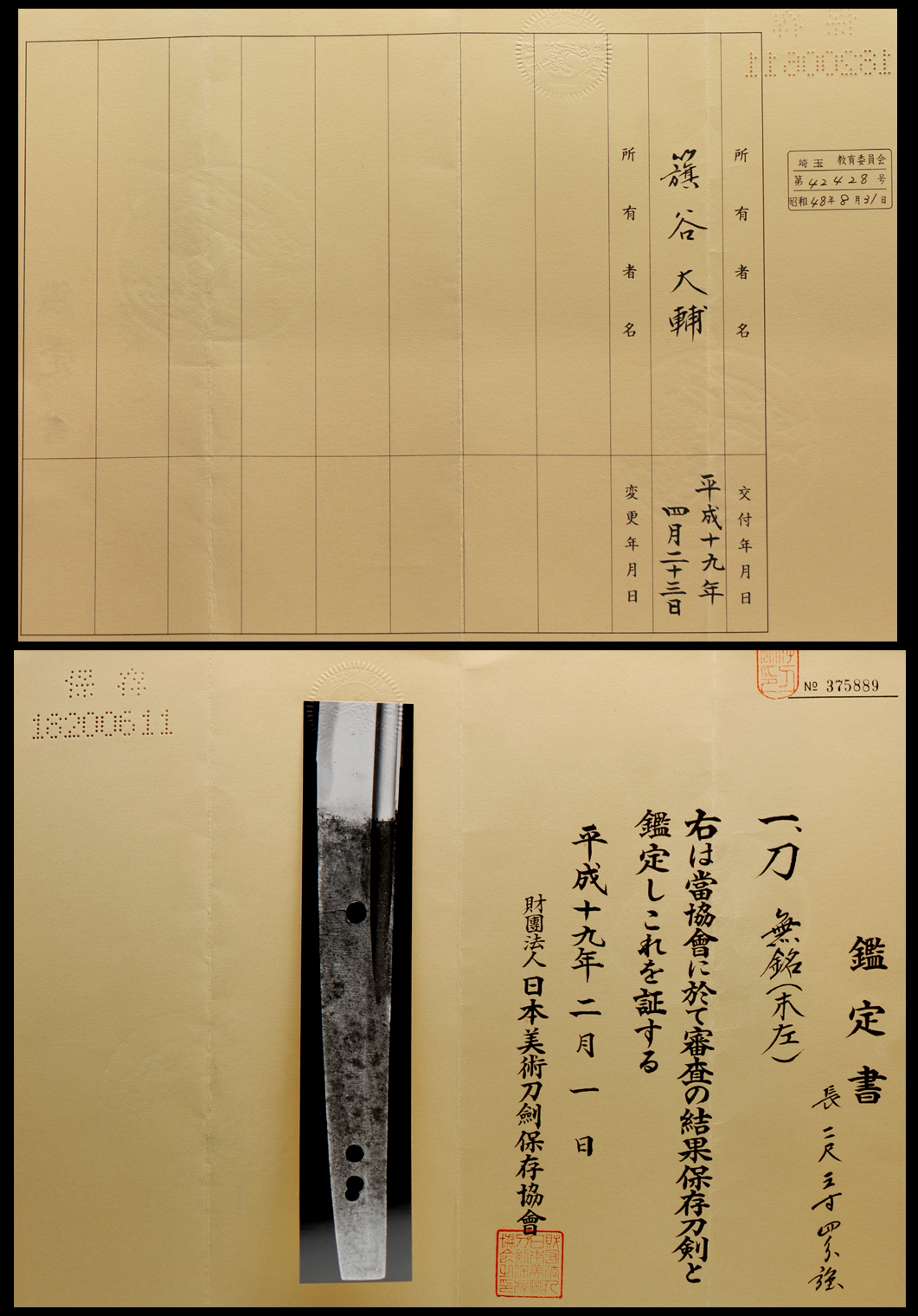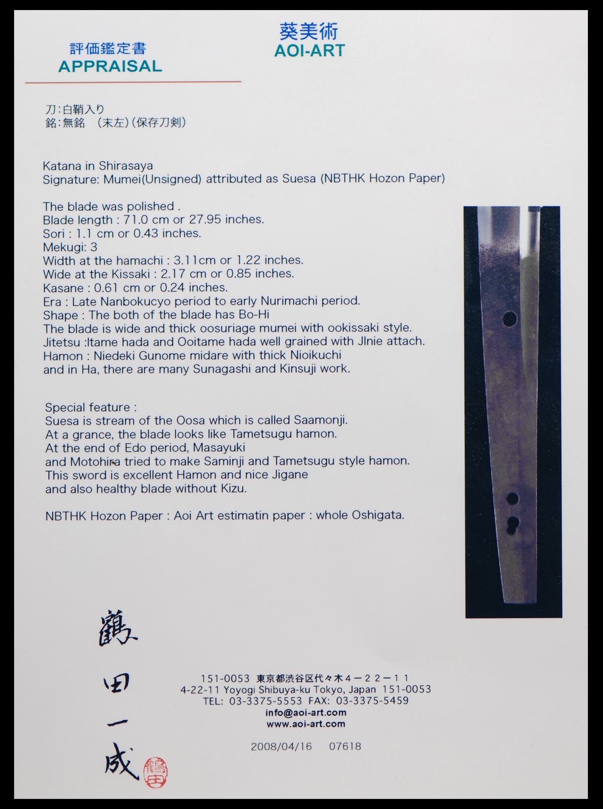 As a result of a shinsa at this organization, the above item has been determined to be Hozon Tôken and authenticated. February 1, 2007 NBTHK