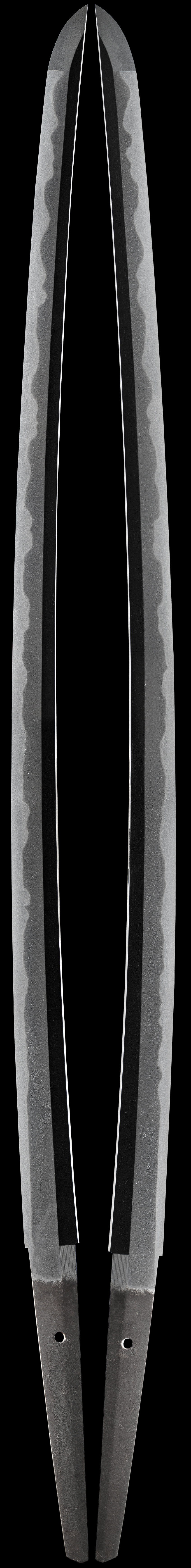 This beautiful long katana is just over 30" long and has a very powerful look to it. The handle and saya is large and original to the blade. The hada is well forged with some course areas in masame hada. The hamon has a lot of activity. The size of this sword and the shape make this a very special katana. The large kissaki is very beautiful and overall this sword has a lot of fine attributes.