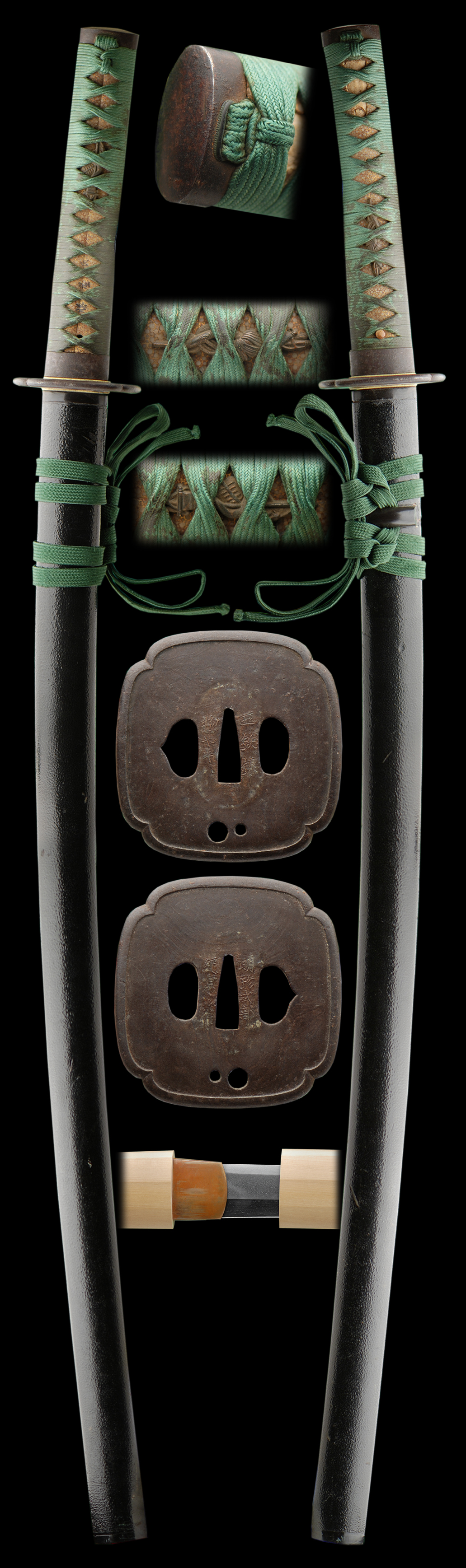 These are great old mounts with nice age and Satsuma History. The mounts even come papered. Papers on mounts is not easy to find, just look around at other websites. So this makes for a great package to a collector. Please note the signature on the tsuba!NTHK PAPERS