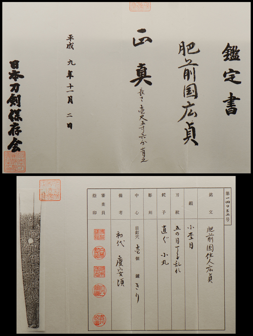 HIROSADA HIZEN [JÔKYÔ 1684 HIZEN] SHINTÔ CHÛJÔSAKUHe is the son of shodai Kanehiro, and became the nidai Kanehiro. He is called Sôuemon, and the shodai was later called Yoshiie. (Refer to Yoshiie) His works are gonome choji, there are also suguba, and both the ji and ha are strong.