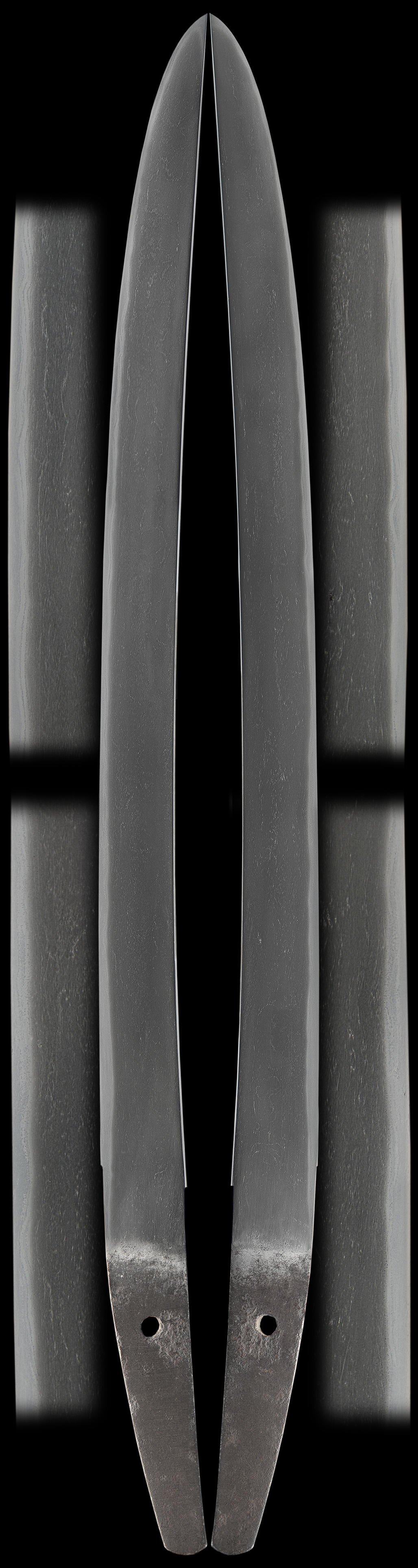 This is a very early kodachi that is very interesting. The hamon has many areas that have niju-ba and it has very fine hataraki. This blade has a feeling of a yamato sword and the hada is of an earlier time period of sword making. The hada is rich looking and is very clear with some utsuri in it. This would be a interesting sword for a shinsa some day.