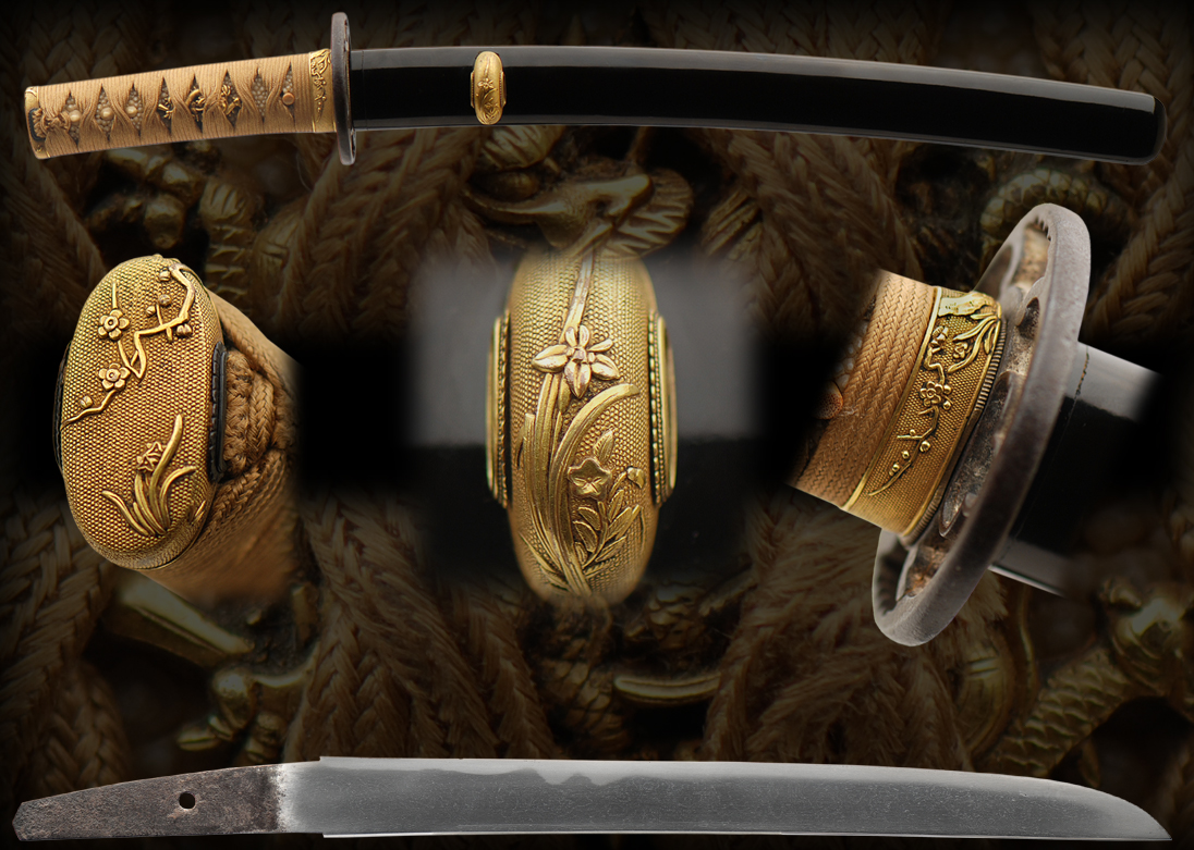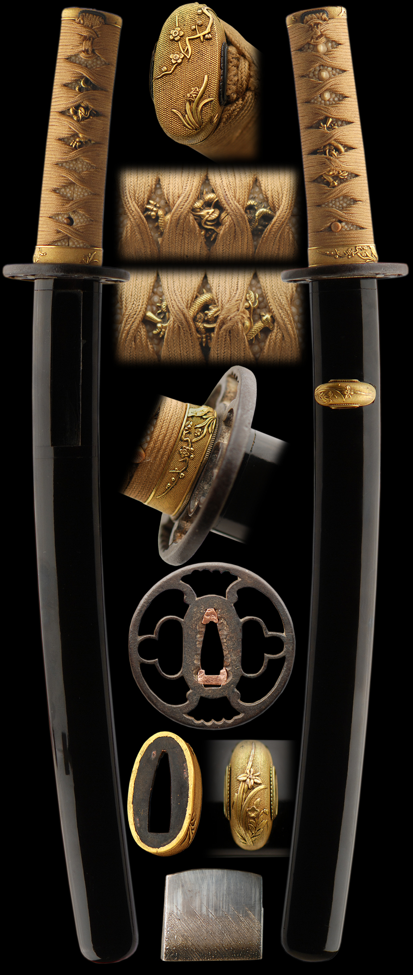 This is an edo period Tanto in very high quality gold foil mounts. The blade is very simple and is unsigned. The quality of the tanto is about average and a true samurai tanto. The mounts on the other hand are very high quality. The handle has been papered and has received the higher kantei-sho papers from the NTHK. This is a very elegantly mounted tanto and will display very beautifully.