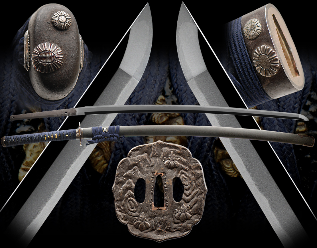 This is a beautiful huge daito that is 32" long with very well forged itame hada and a excellent suguba hamon. Also some masame is mixed in the hada especially in the boshi. The fact that this sword is very strong and large does not deter it from being very elegant and exquisite. It is very typical of fine Japanese taste, The Japanese call this shibui, basically not flashy but deep in quality. The hamon is very active and in hand this sword is very impressive. This daito is made in shoshu style during the shin-shinto era by a good swordsmith. A sword like this with true samurai style mounts that is signed and dated is a fine sword for any collection.