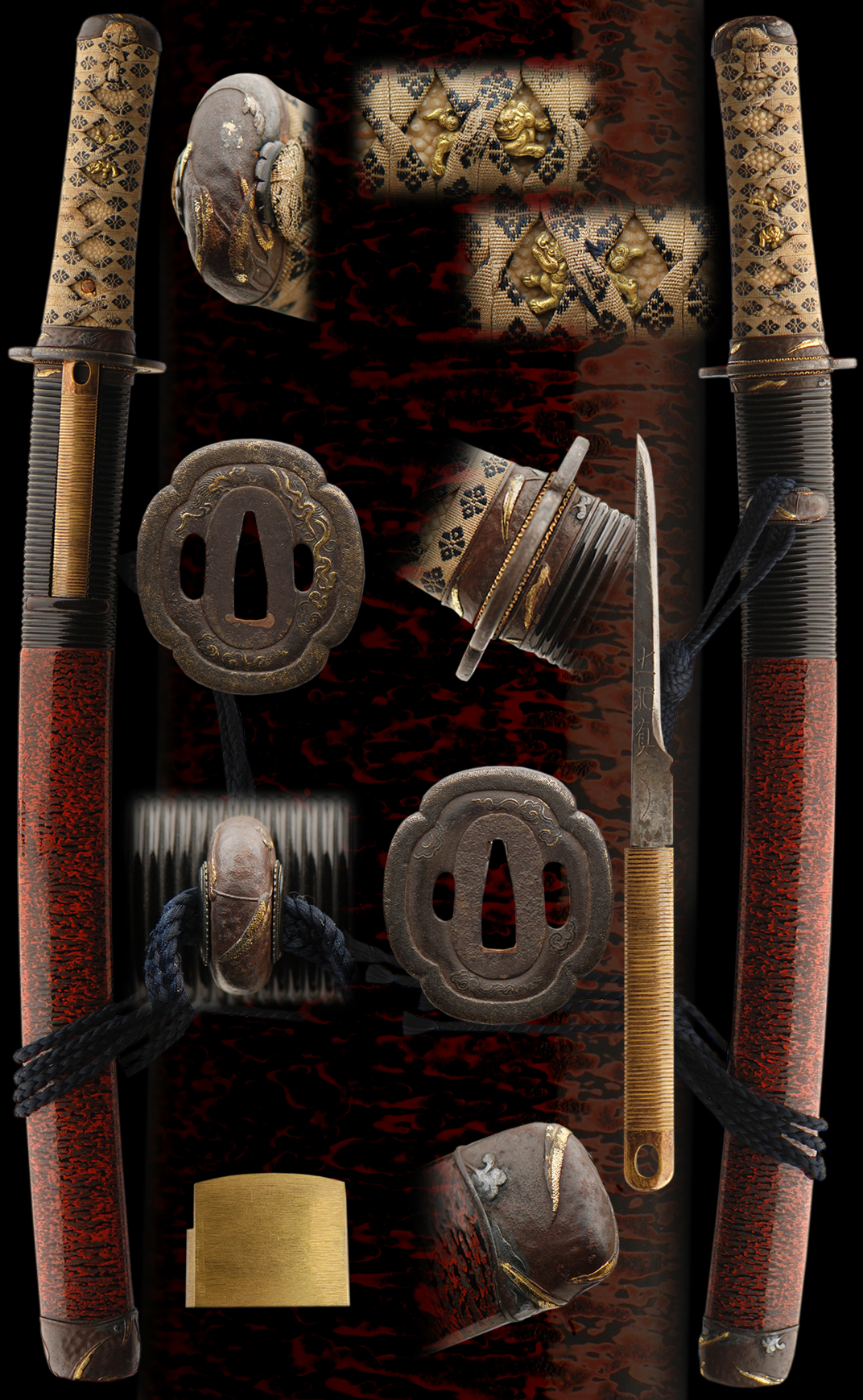 This is a very well mounted wakazashi in hirazukuri style. The fittings are matching and the lacquer work is very high class. The blade is also forged well with running course running masame hada in places. This is a very strong blade that is signed and dated by the maker. This is a fine example of a shin-shinto era sword with its original mounts. We recommend a shirasaya for it in the future and refreshing the polish to bring out even more details but it can be enjoyed also in the fine condition that its in now.