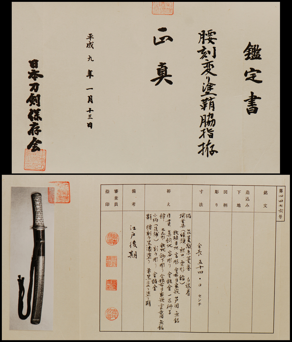 This wakazashi comes in a fine old polish and in mounts. It is also accompanied with two papers, one for the blade and one for the mounts attesting to the quality of this fine wakazashi.