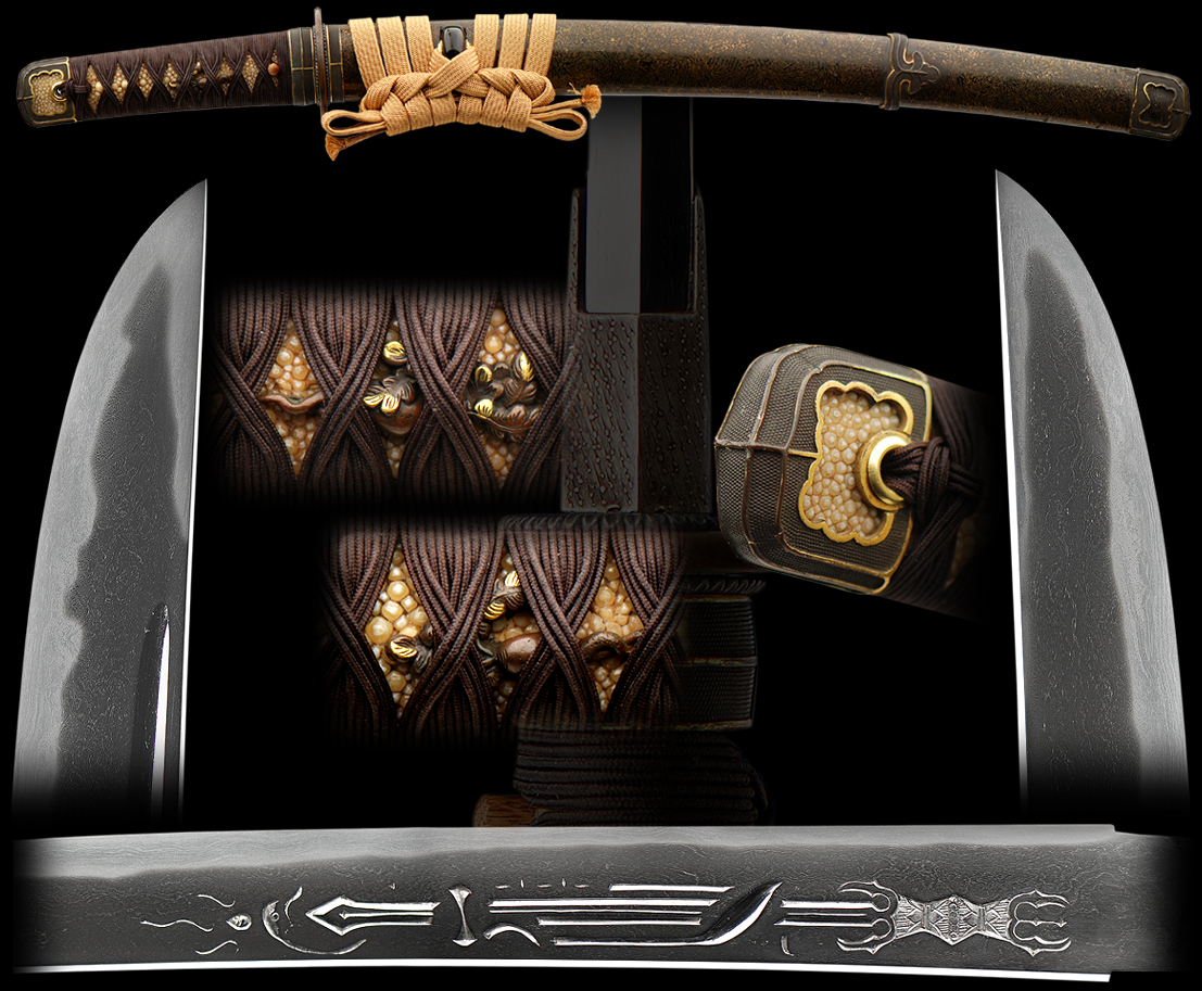 To start with this is a very thick blade and can be classified as an armor piercing blade. The work on this fine blade beautiful and it has a well carved horimono of a dragon and ken. For a koto blade it is very healthy. The hada is rich looking and very clear and well forged. The hamon has many hataraki in it. Ashi, sunagashi and much more activity can be found on this blade. The mounts are also in great condition and that says has gold mixed in the lacquer to add to its beautiful but tasteful look.