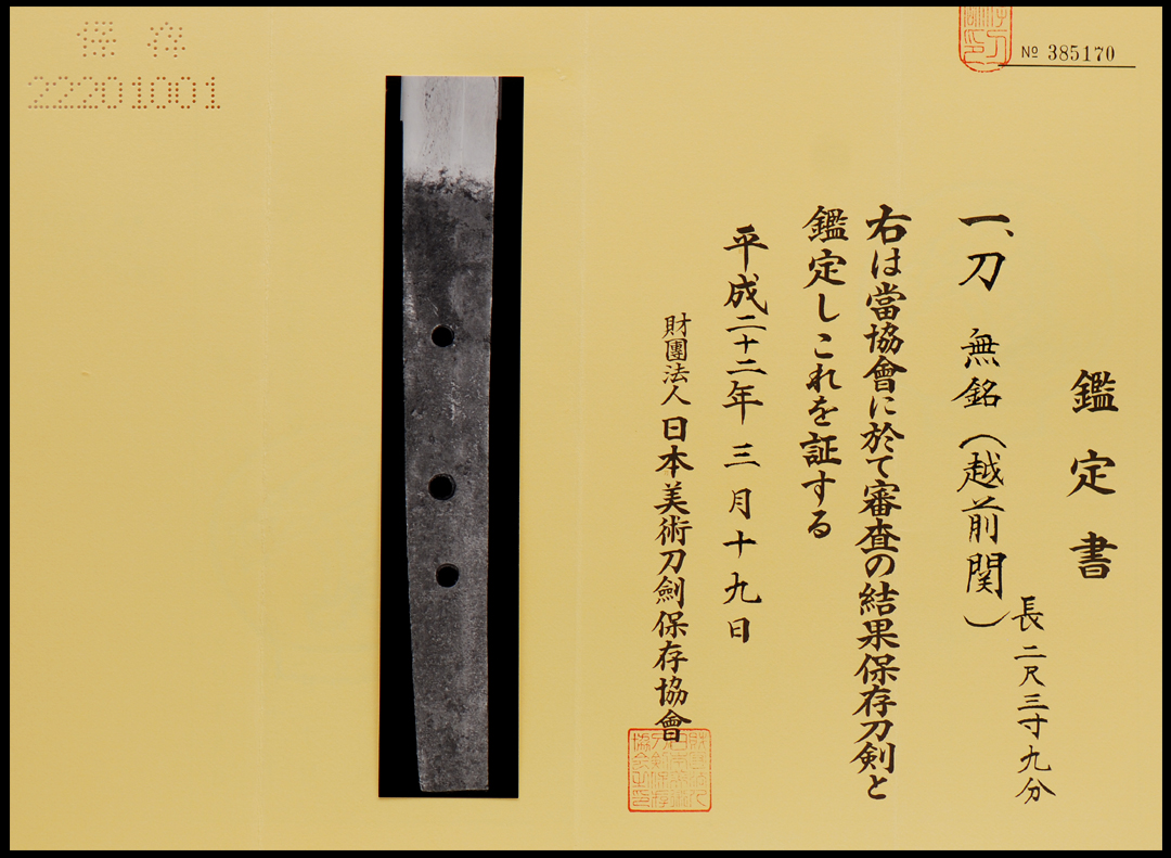 As a result of a shinsa at this organization, the above item has been designated a Hozon Token, and is confirmed as authentic.