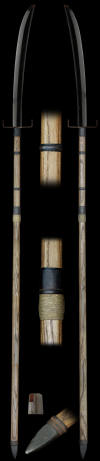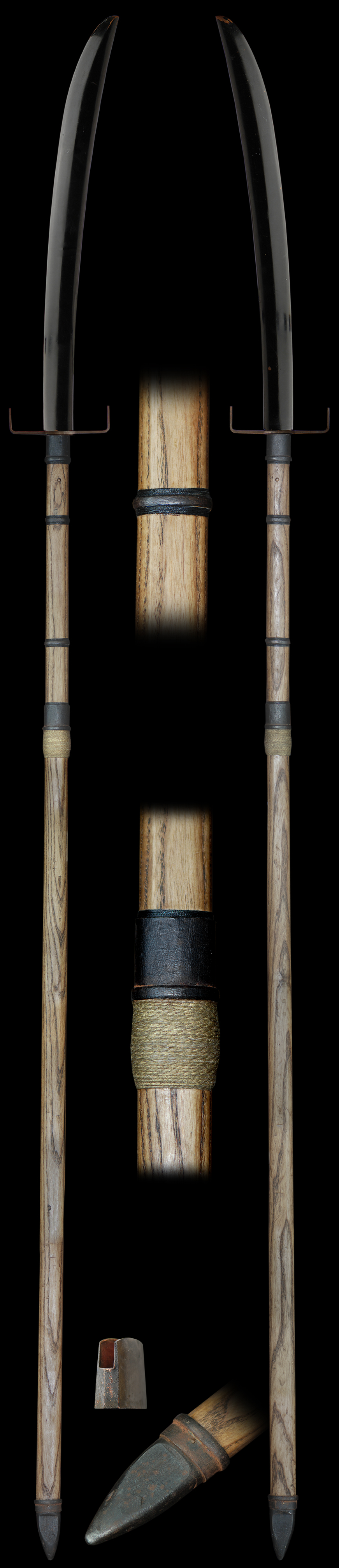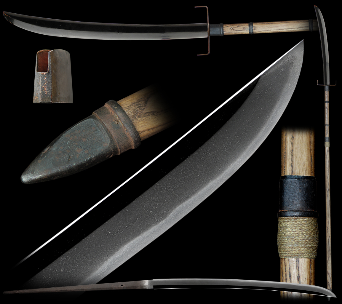 This is a very lovely Nagamaki. Normally you find many naginata but few nagamaki especially this long so it is a very good pole arm for a collector. The work on this long blade is very fine. The hada is rich looking and well forged. The hamon is notare/suguba and is elegant with a fine nio. We highly recommend a shirasaya for this nagamaki. The pole is also interesting with a hooked tsuba for protection. This is a very nice pole arm for a collector.