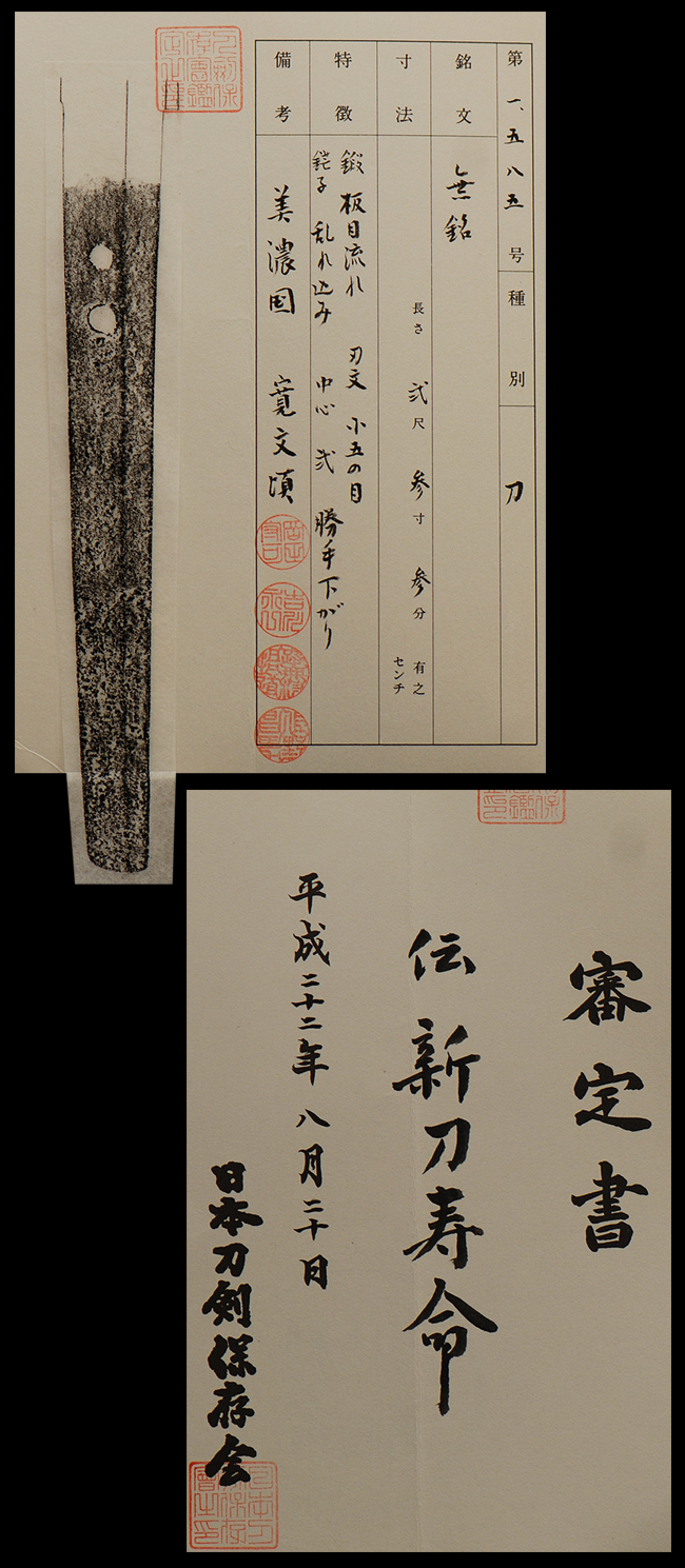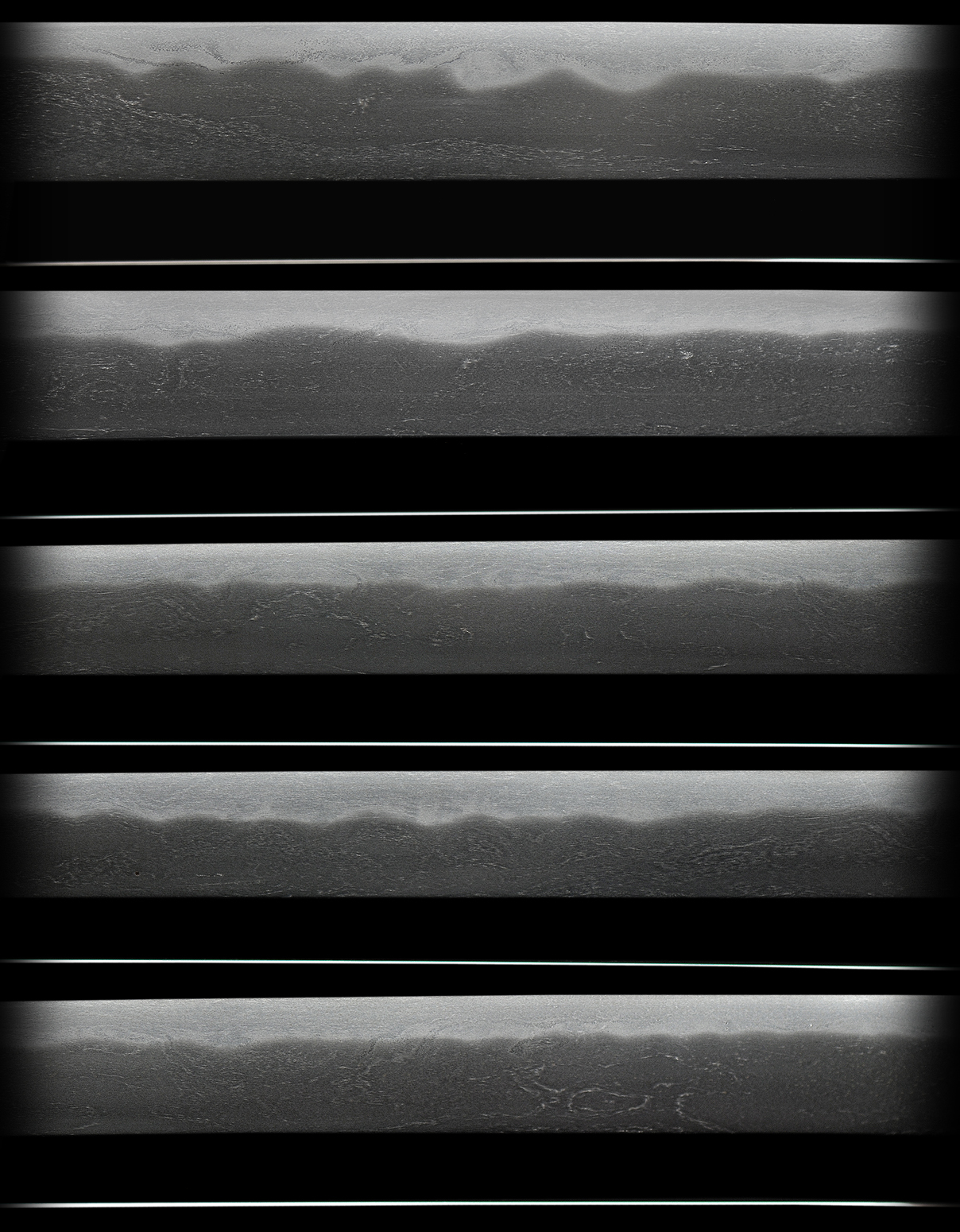 Mino school swords were desirable because of there fame of cutting well. The is a Jumyo school katana that is rather long and very sound. It has course hada in places. The hada is itame and forged well with a dark appearance to the steel. the hamon has a large amount of hataraki/ activity and is very nicely done. The shape of this katana is graceful and well balance and is a fine example of a shinto era katana.