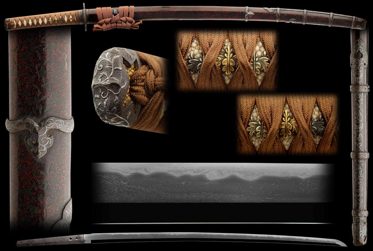 The mounts on this blade should receive papers also as they are very good. The koshirai is all matching and made by the same person. The fittings are subtle but very detailed in the inlay work. The saya is beautifully lacquered in a unique style and is sound. The saya has no splits and has some wear from carrying in the belt. The mounts on this sword is very good quality samurai style, elegant and deep not flashy.