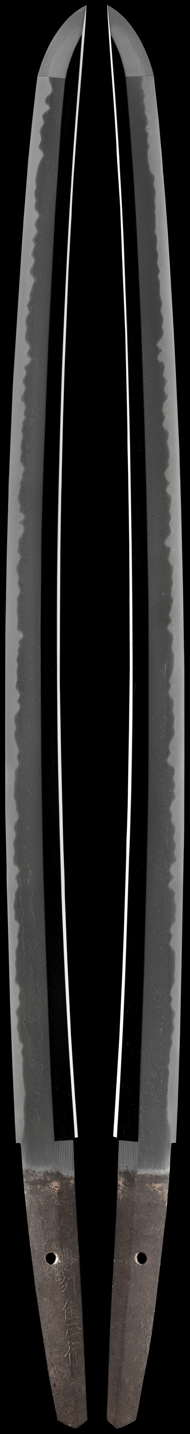 This signed wakazashi is a fine example of a Takeda school sword made by masayuki. Masayuki is listed as a smith from jokyo era 1684 forward. This sword has some minor course hada and has also some very densely forged hada. The color of the steel is milky looking and is well forged. The hamon is very well done and the habuchi is well made. The hamon has many hataraki/activity that add to the quality of the blade. The Takeda school swords were very well respected as functional swords that cut very well.