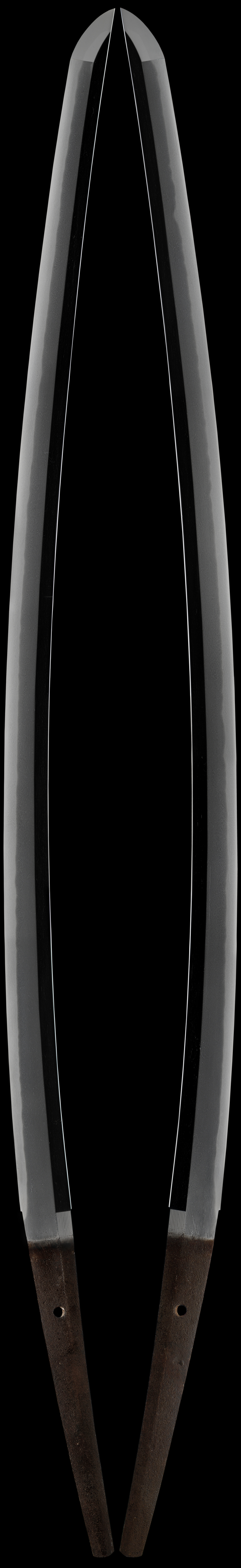 This long Takeda school daito has a very deep curvature and is well made. The hamon is suguba with many ashi and hataraki in it. The hada is well forged and has a milky look to it. The overall shape with its curvature and the feel of this blade is very elegant and not flashy. The takeda school is very well known school that was renowned for making very good quality swords but also very practical weapons that cut very well.