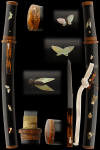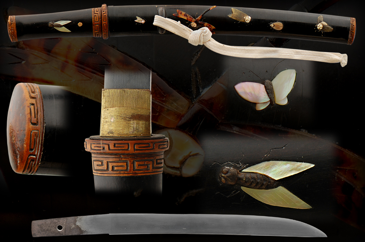 This is an early tanto that was mounted in elaborate inlayed koshirai. The blade itself is not of high quality but the mounts are very interesting. These mounts are in insect motif and have many different inlayed materials from horn, ivory, mother of pearl and many others. This is more of an art peace to be enjoyed the the craftsmanship.