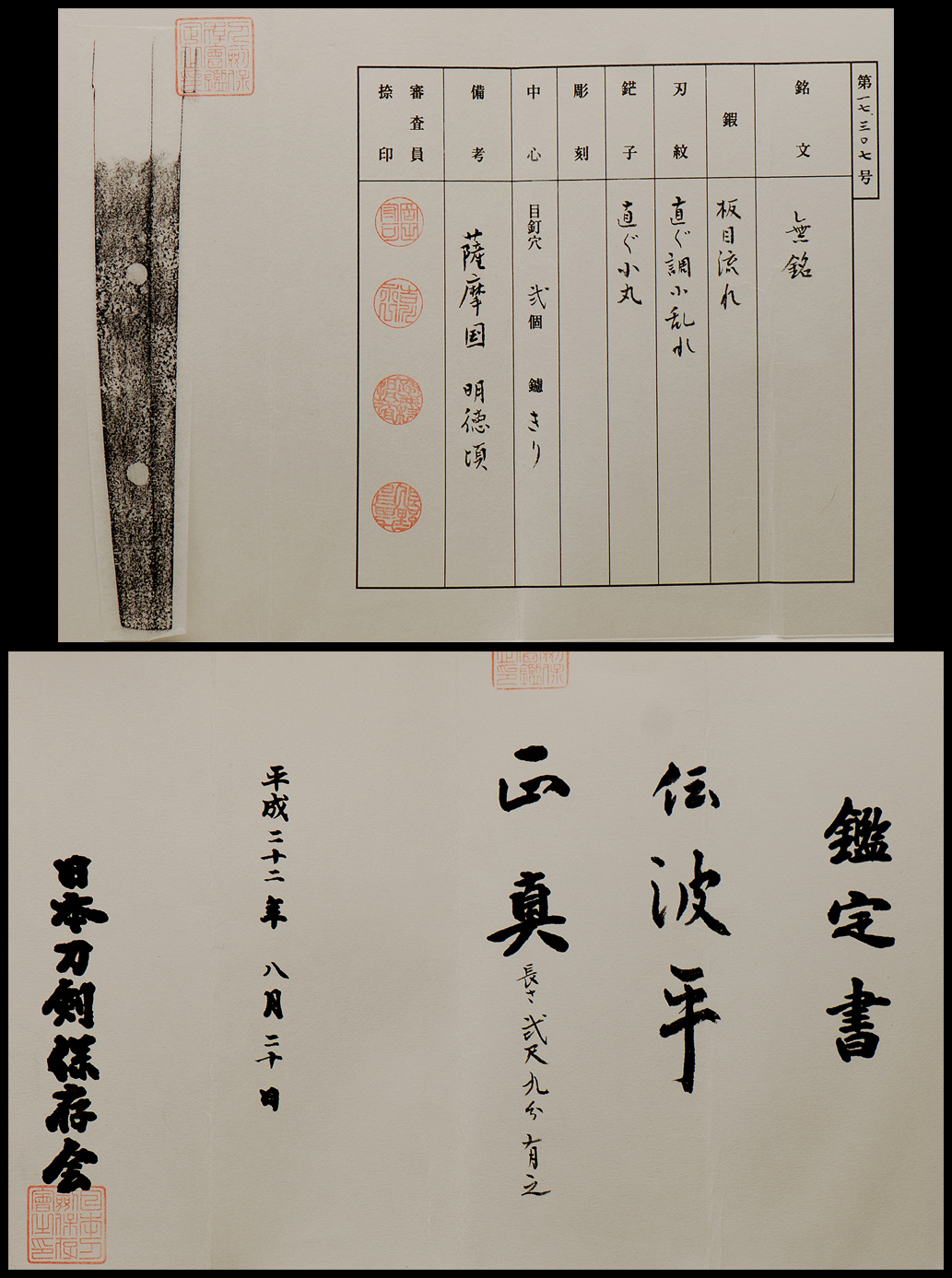 Nakago: Two mekugi ana, Yasurime is kiri