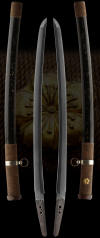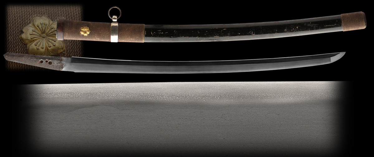 A Shinto (1700�s) era wakazashi that is in a very old polish. The overall shape and condition of this sword is good but the polish does not reflect the quality of this blade. It appears to be made in the mino tradition of sword making. This sword should be polished and submitted to shinsa to receive a paper attesting to the make and quality of this blade. The saya is a military scabbard.