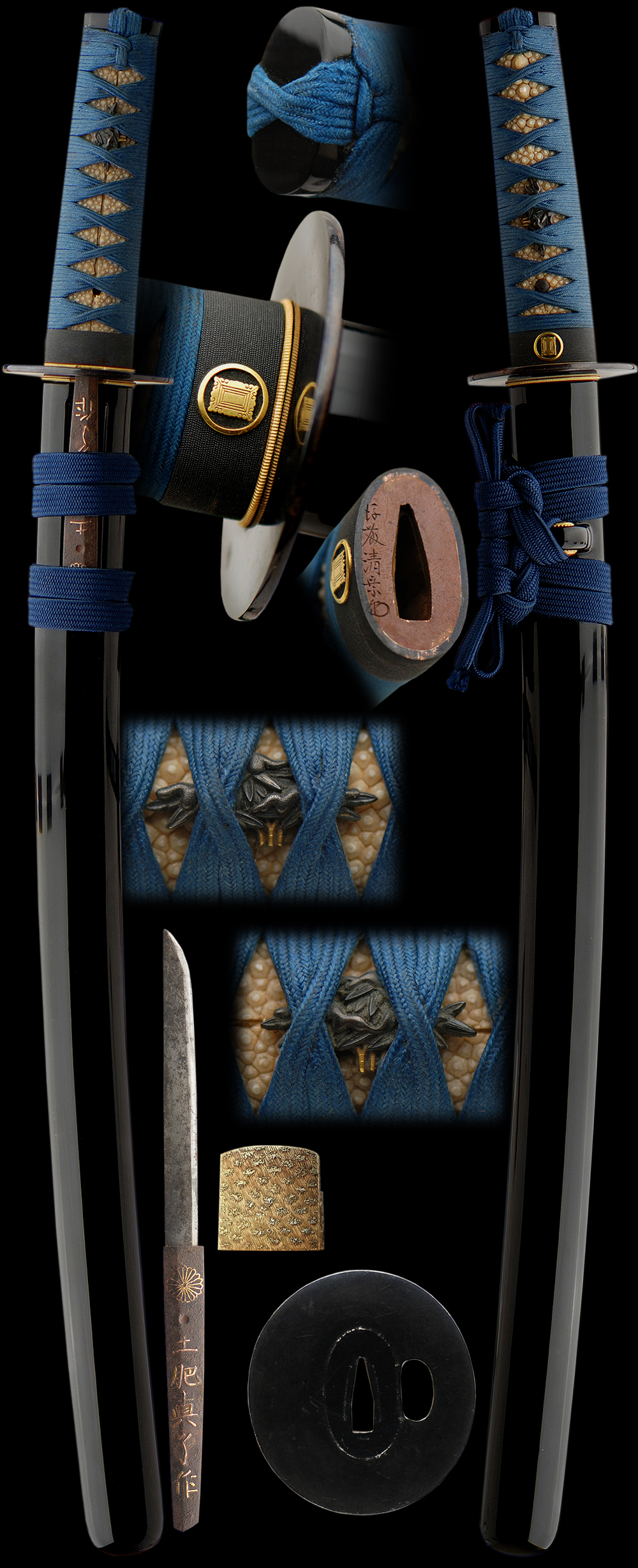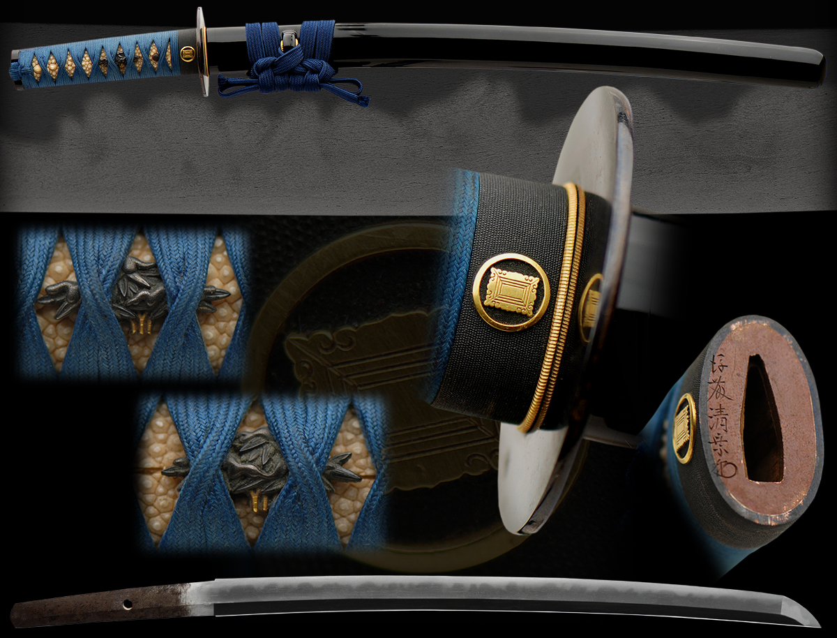 This is a beautifully made wakazashi in elegant mounts. The mounts are very well made. The koshirae is not fancy but are more of a true samurai style and very utilitarian. They are plush looking without a flashy appearance. The blade is very well forged and the hada/grain texture is smooth looking and dark. The hamon is very active and has abundant hataraki/activity. It is nioi based, nie mix with many ashi visible. The shape is very nice with a well balanced curvature. This sword with original mounts is a very fine blade and should be submitted for shinsa/appraisal some day.
