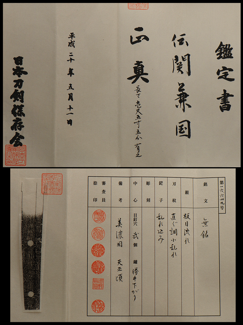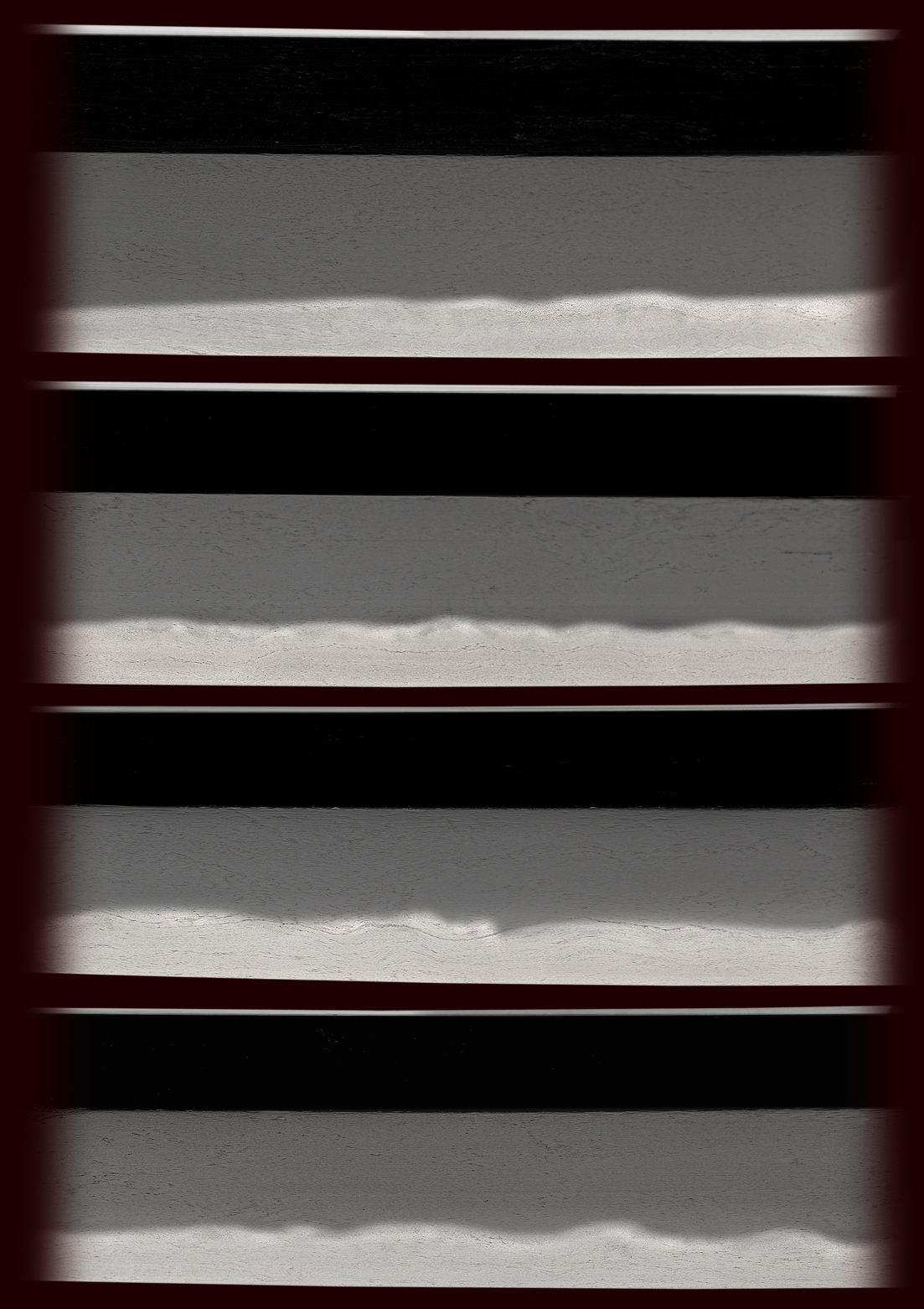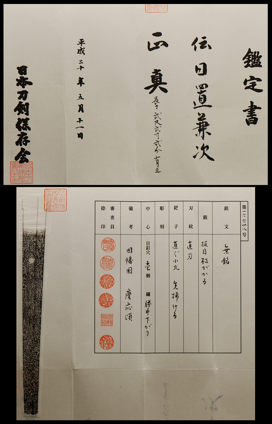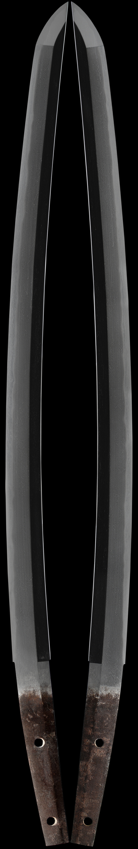 The Dai-to was attributed to Den Kanetsugu. A beautiful blade in pristine polish and loaded with activity from the Shinshinto period. Within the Sugu-ha there is hotsure, sunagahi and kinsugi. The hada is a dense and beautiful itame and mokume mix with some masame.