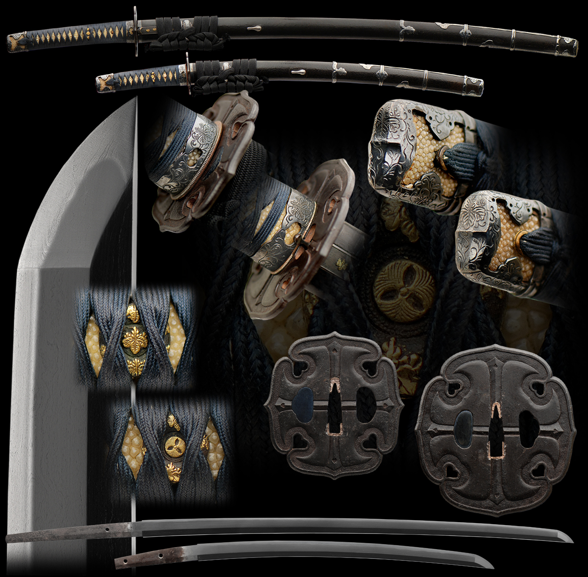 Condition: polishedA true Samurai Daisho, These swords are mounted in a spectacular Handachi style Koshirae of Shakudo. The Motif is of Samurai clan Mons and are in pristine condition. The mons that are used are called Paulowinia, it is a flower pattern referred to in Japanese as Go-Shichi-No-Kiri and was used to represent the Prime minister of Japan in later times.