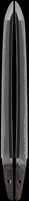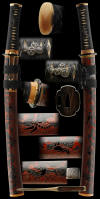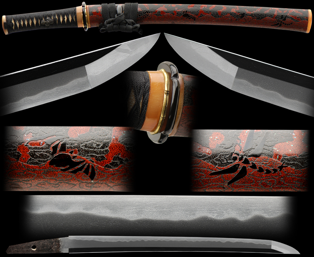 This is an exquisite ko- wakazashi. The finer aspects of this koshirae are very unique. The tsuba/guard is made of carved horn and is in a highly polished finish. Most of the fittings are also carved in horn but are of a lighter colored horn. The saya/scabbard is the icing on the cake. The lacquer is very precious with many ornate animals and beautiful details. The overall condition is excellent, and is a splendid work of art in itself. The blade is also very well made and has no flaws or stains. It is in a fresh polish and the hada and hamon can truly be appreciated and enjoyed. The hamon is nioi based in general and has a very wavy hamon in a gunome style. It has activity/hataraki in places and is subdued in other parts. The hada is very tightly forged and is opulent in finish with ji-nie. The sword should be submitted to shinsa in the future to add to its overall value.