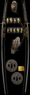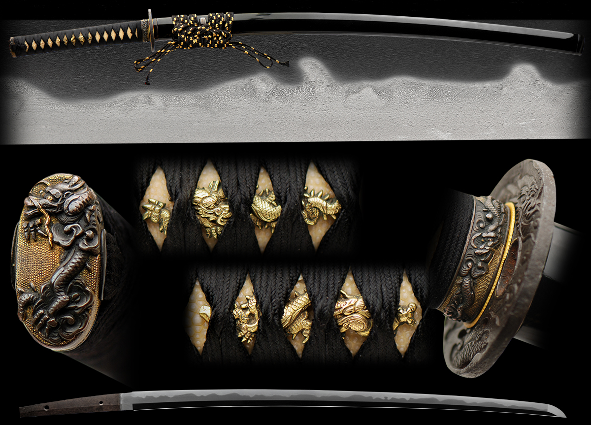 The koshirae is a mix of stunning dragons with a gold finished habaki. Overall a beautiful sword with mounts in the Yokoyama Bizen tradition of Sukekane.