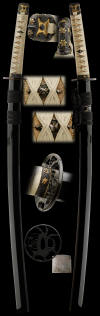 The koshirae is fitted with exceptional furnature of shakudo and gold. The tsuba is open work and quite beautiful. The old same(rayskin) is striking in contrast to the string wrap. A true high end mounting to fit this wonderful koto sword.