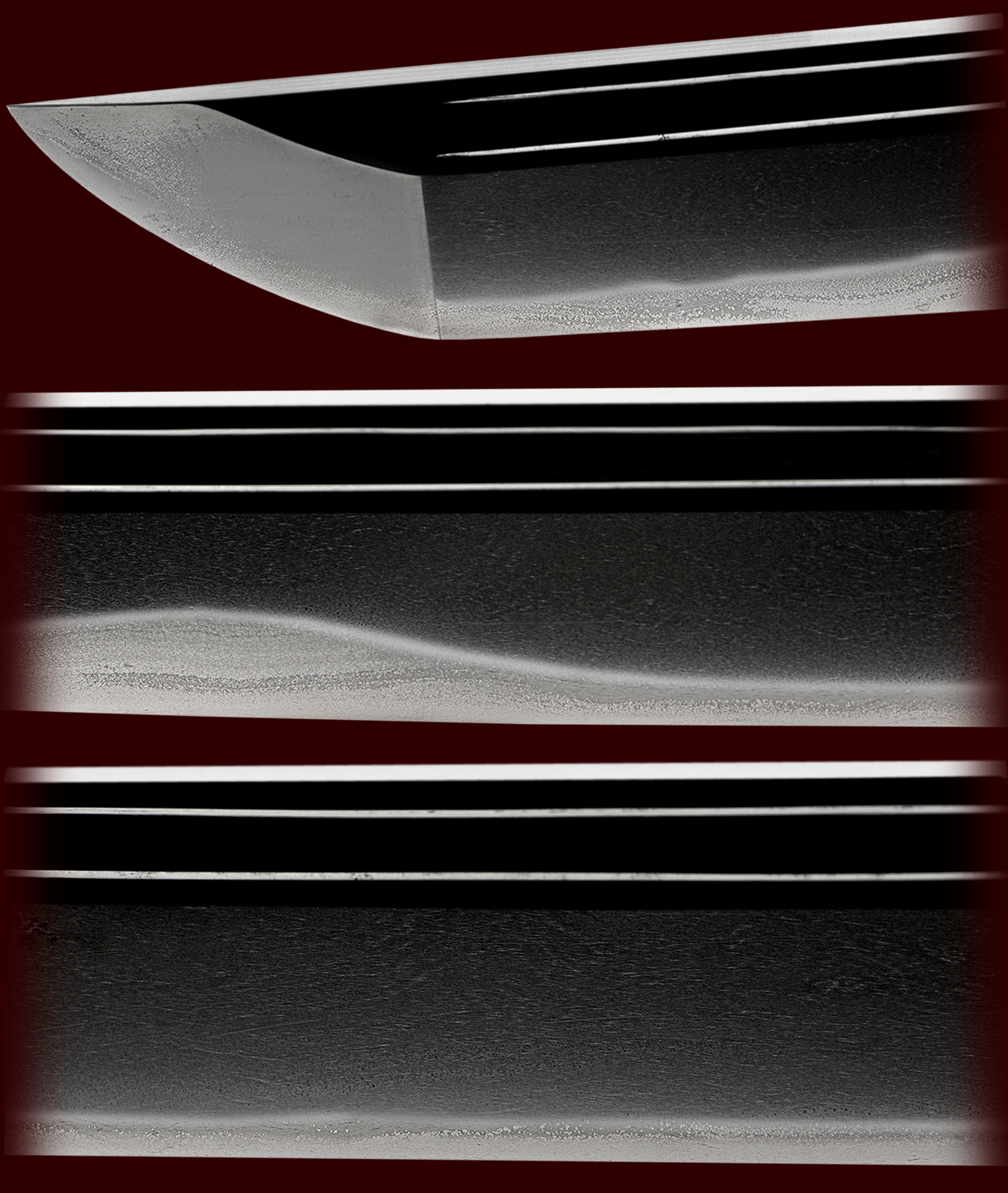 A well made koto blade of the Mihara school. This blade is believed to be from the Tenmon era of thev 16th century. The hada is a beautiful Itame nagare with mokume and much ji-nie. Utsuri appears on the ji. The hamon is a rich wavy Sugu-ha with much hataraki for your viewing pleasure. The undulating hamon is sprinkled with nie the entire length of the blade and there are mountainous wisps of sunagashi throughout. The boshi is ko-maru. The Mihara School started in Bingo Province around the Shochu era (1324 - 1326), according to Yamanaka, "Descendants of the late Mihara School and of the Goami School made a few blades." Bingo is on the Sanyodo Highway, on the south side of the western portion of Honshu, the main island of Japan. It faces the inland sea, beside Bitchu province.