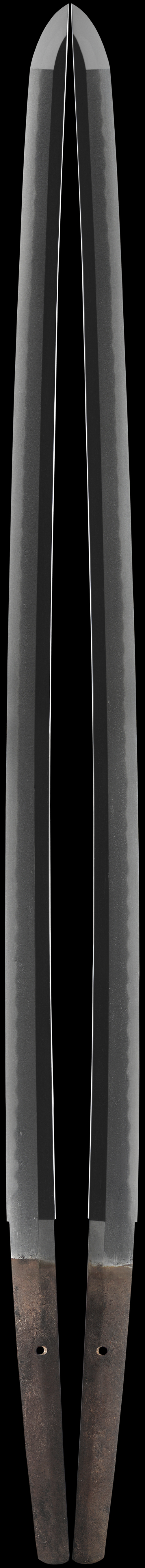 A beautiful sword in the Bizen tradion this blade is longish and quite well made. The hamon is a uniform gunome representing the rolling ocean waves. it is nioi based with ko-nie and activity appears. the hada is an oily darkish jigane of dense mokume. Ji-nie appears on the ji. the sword has slight curvature and may be kanbun shinto.