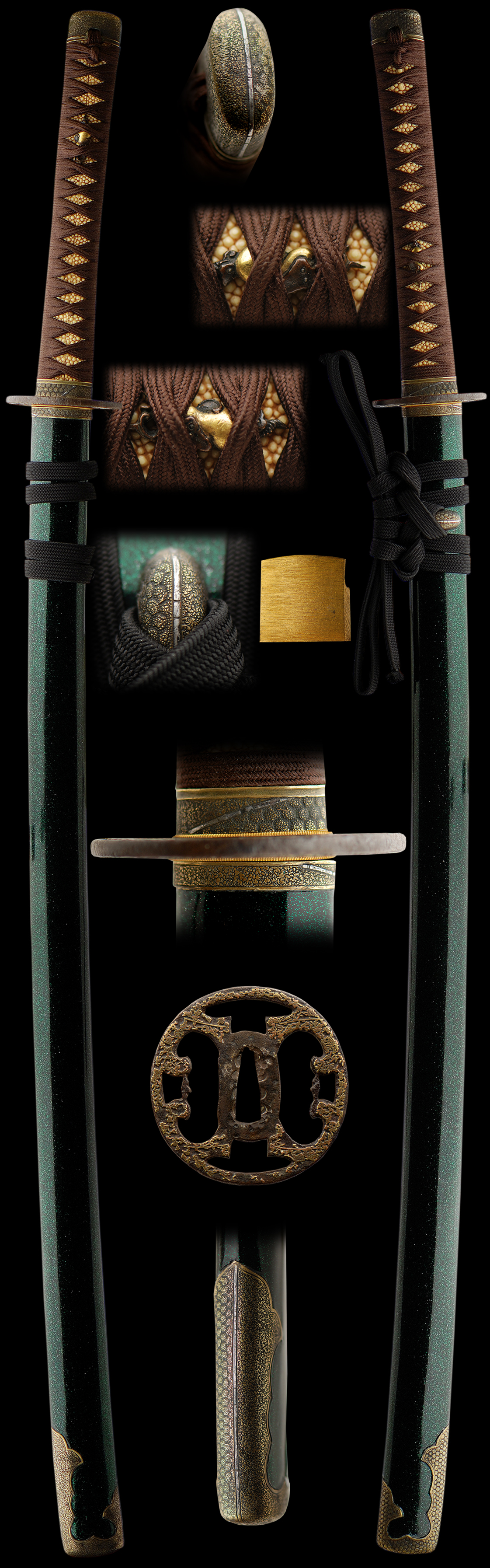 The mounts are a matching higo style with incredible Abolone suspended in lacquer finish to the saya. The Tsuba is ornate with the gold intact. The higo mounts match throughout the koshirae which consists of fuchi/kashira, kojiri, koiguchi and kurikata. These mounts are original to the sword and to be appreciated for there completeness