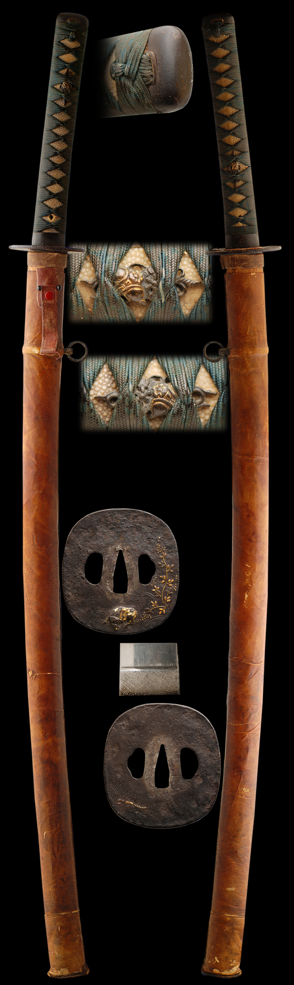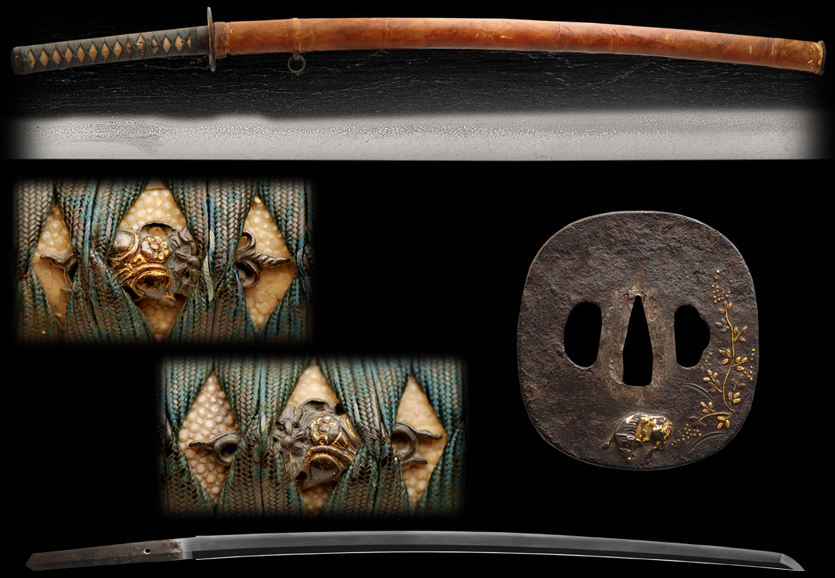 The koshirae is civilian mounted with war era leather covered saya. The fittings are a mix of floral and animal motif. A beautiful sword for the collector and or martial artist. Habaki is finished in silver foil with rain storm pattern.