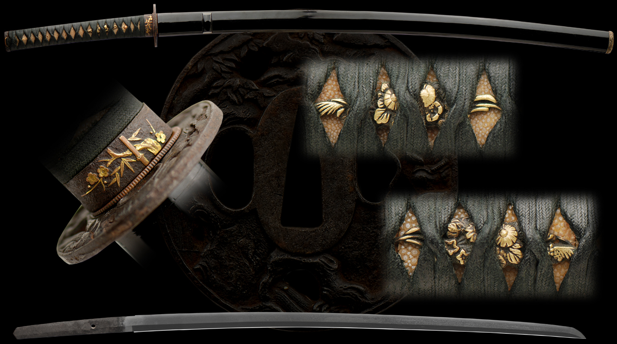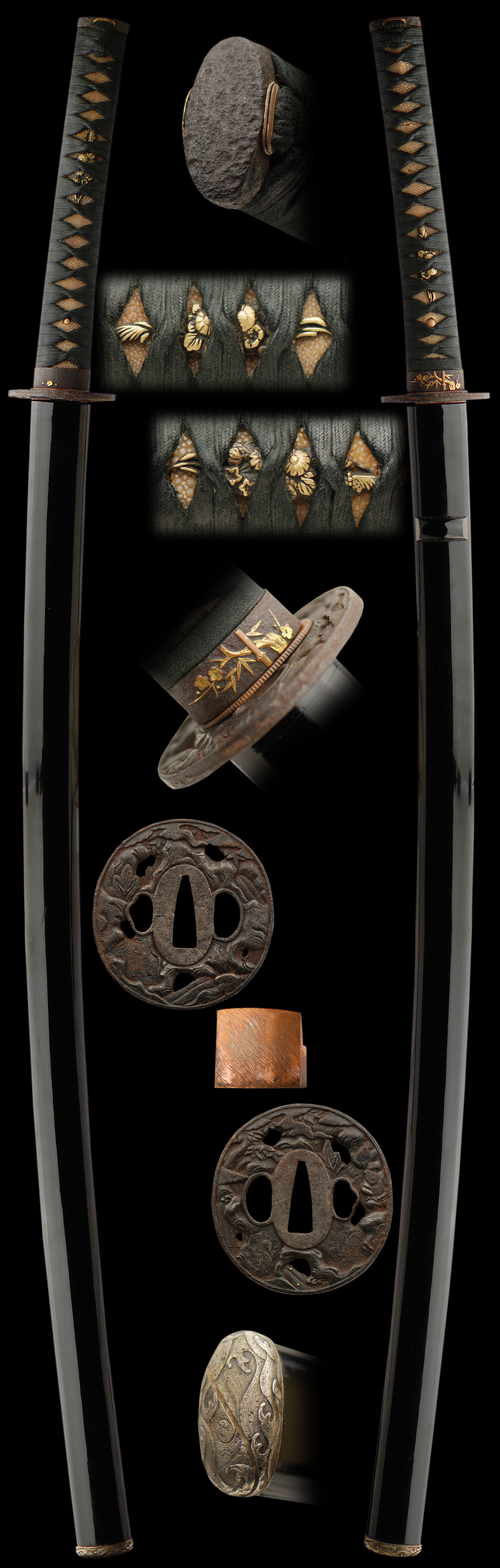 The koshirae is a solid unit with a mixed floral motif of iron throughout. The kojiri is of waves and the saya is in a black lacquered finish. The old blue ito reminds one of true Samurai mountings!